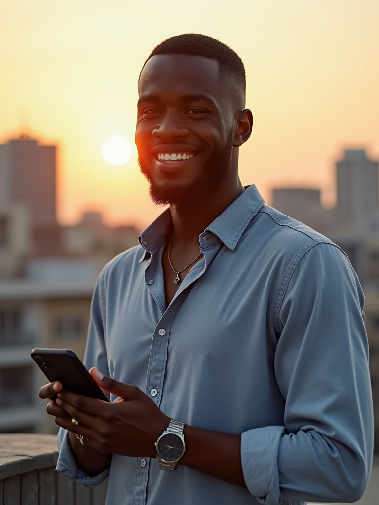 inspiring model wearing premium casual shirt with designer watch with smartphone, urban rooftop meeting space, skyline background, sunset lighting