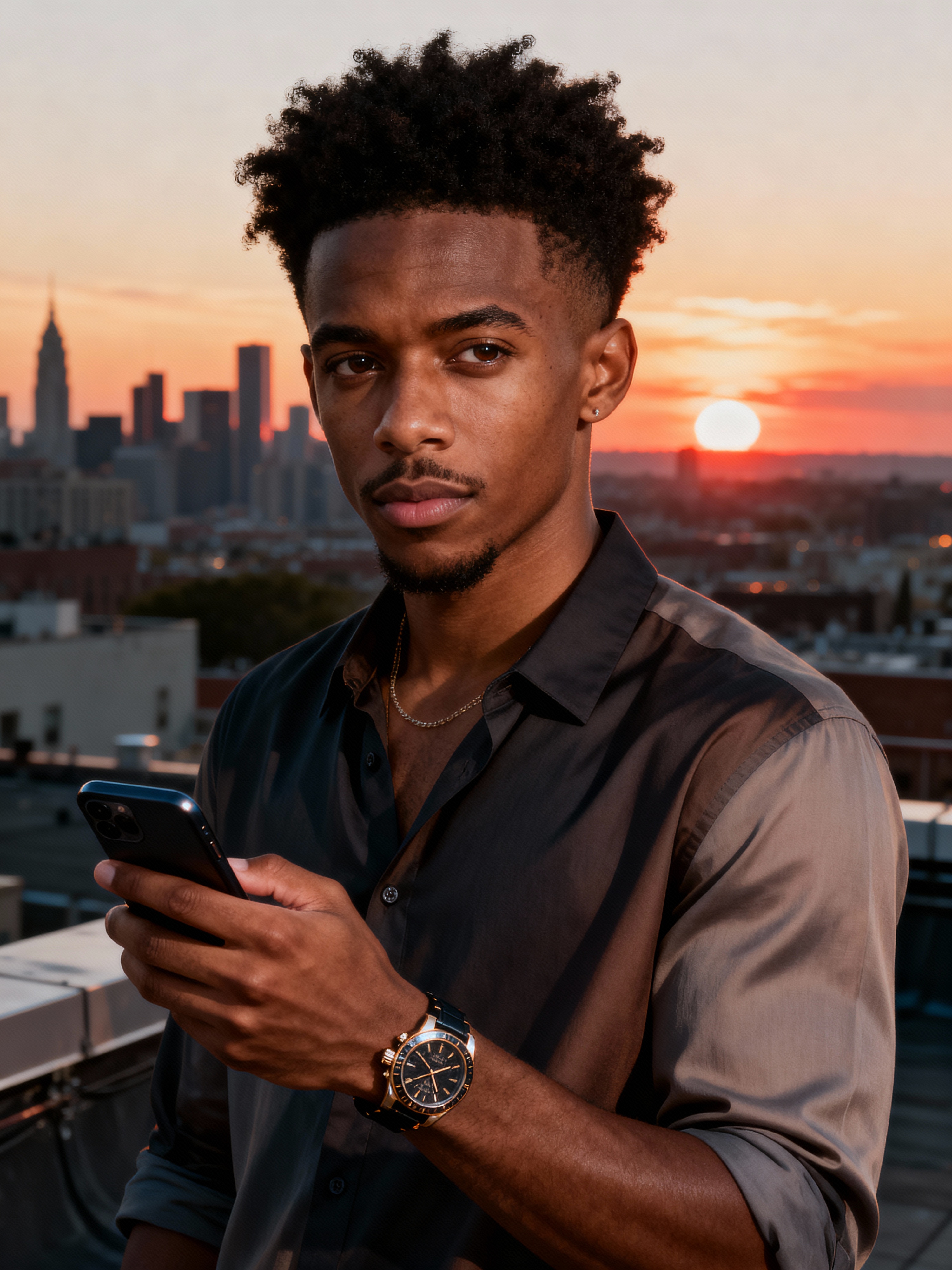 inspiring model wearing premium casual shirt with designer watch with smartphone, urban rooftop meeting space, skyline background, sunset lighting