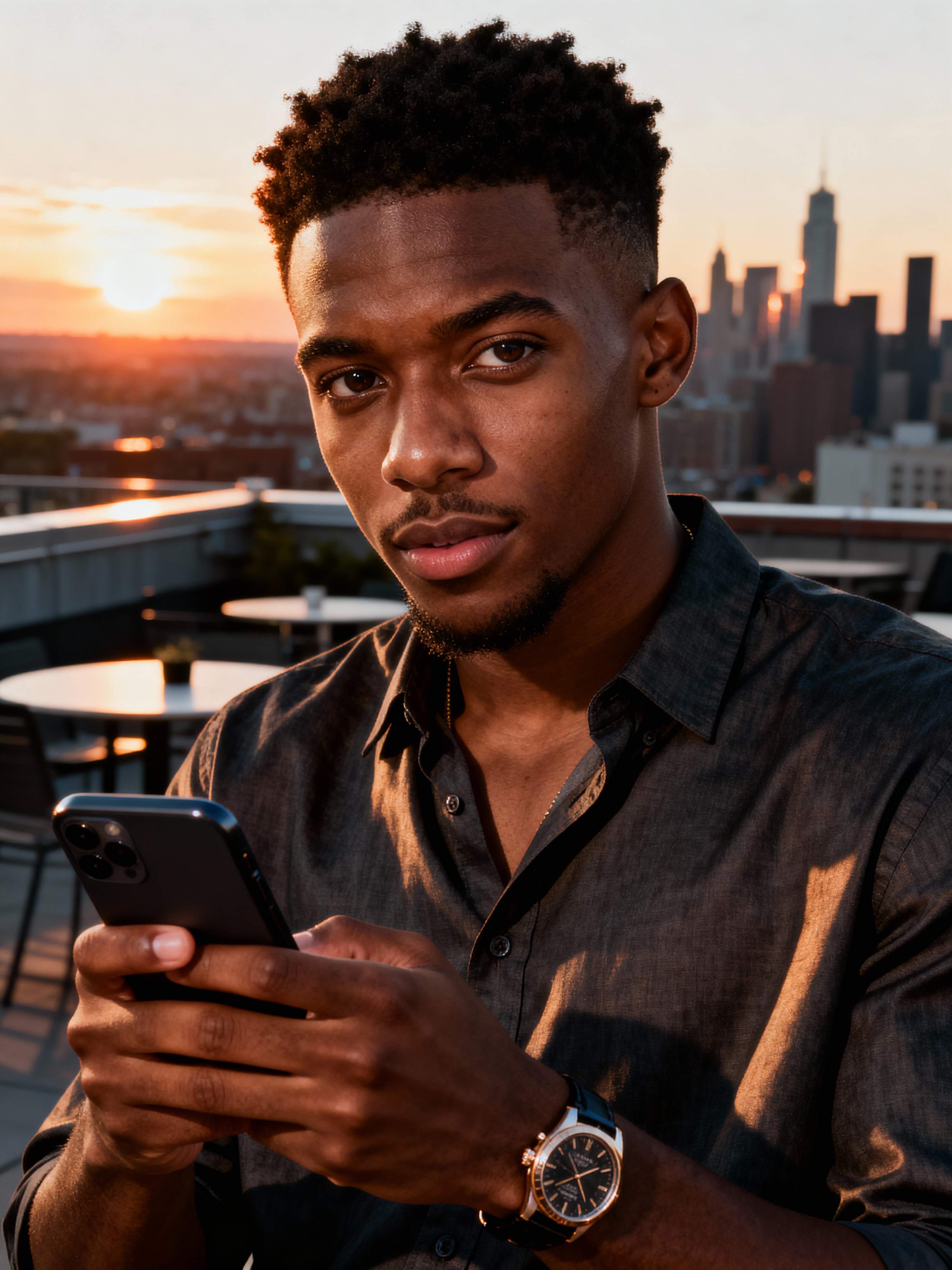 inspiring model wearing premium casual shirt with designer watch with smartphone, urban rooftop meeting space, skyline background, sunset lighting