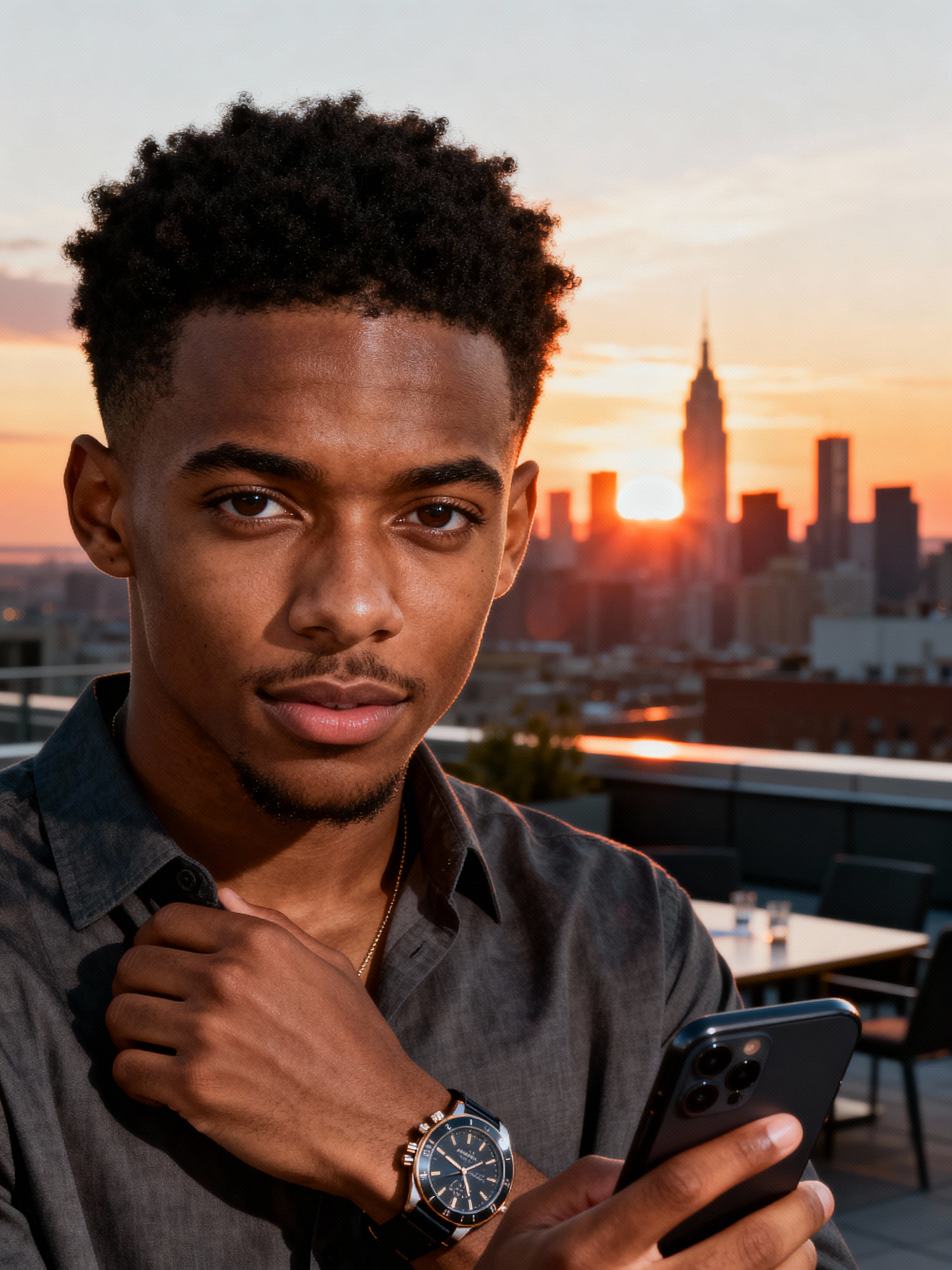 inspiring model wearing premium casual shirt with designer watch with smartphone, urban rooftop meeting space, skyline background, sunset lighting