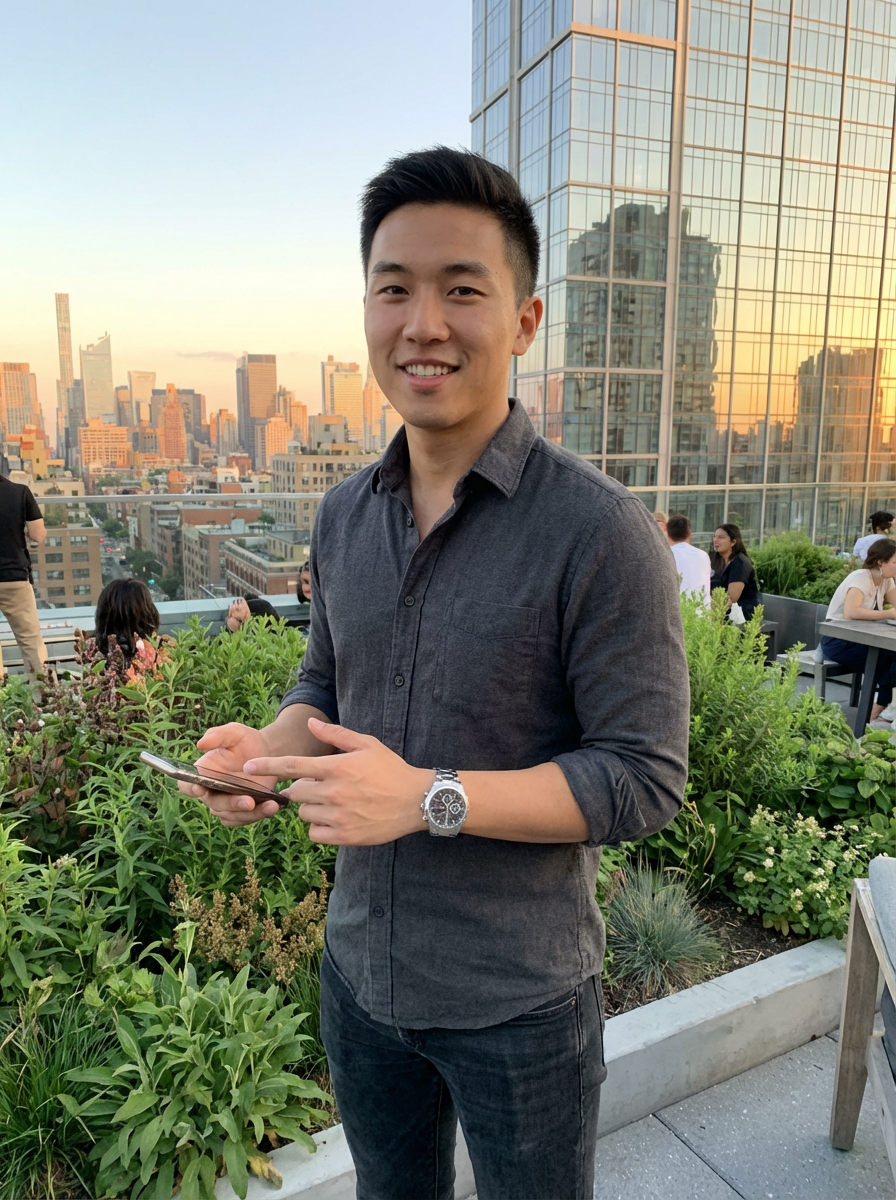 inspiring model wearing premium casual shirt with designer watch with smartphone, urban rooftop meeting space, skyline background, sunset lighting