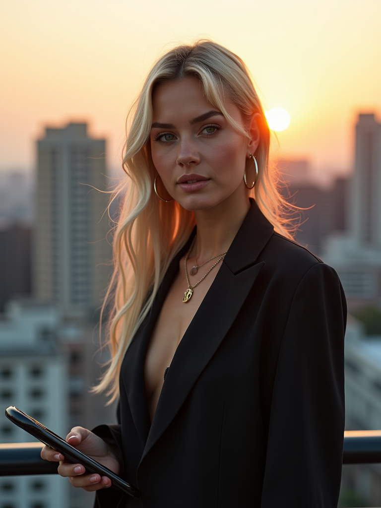 inspiring model wearing sophisticated yet trendy outfit with statement accessories with smartphone, urban rooftop meeting space, skyline background, sunset lighting