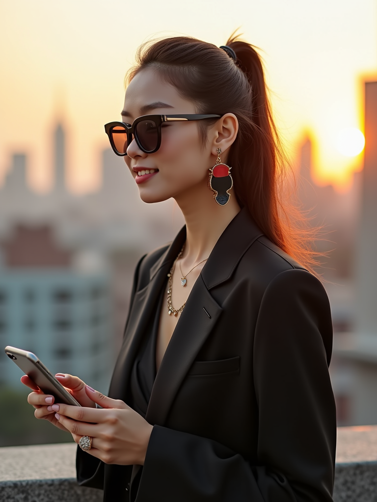 inspiring model wearing sophisticated yet trendy outfit with statement accessories with smartphone, urban rooftop meeting space, skyline background, sunset lighting