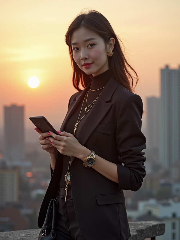 inspiring model wearing sophisticated yet trendy outfit with statement accessories with smartphone, urban rooftop meeting space, skyline background, sunset lighting