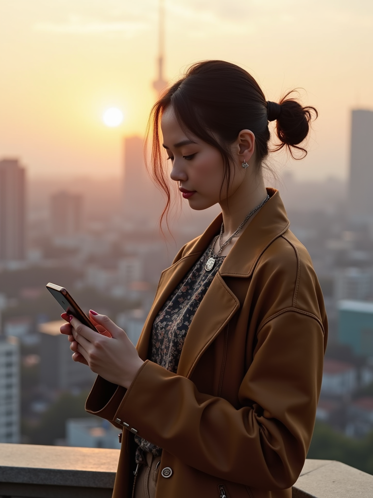 inspiring model wearing sophisticated yet trendy outfit with statement accessories with smartphone, urban rooftop meeting space, skyline background, sunset lighting
