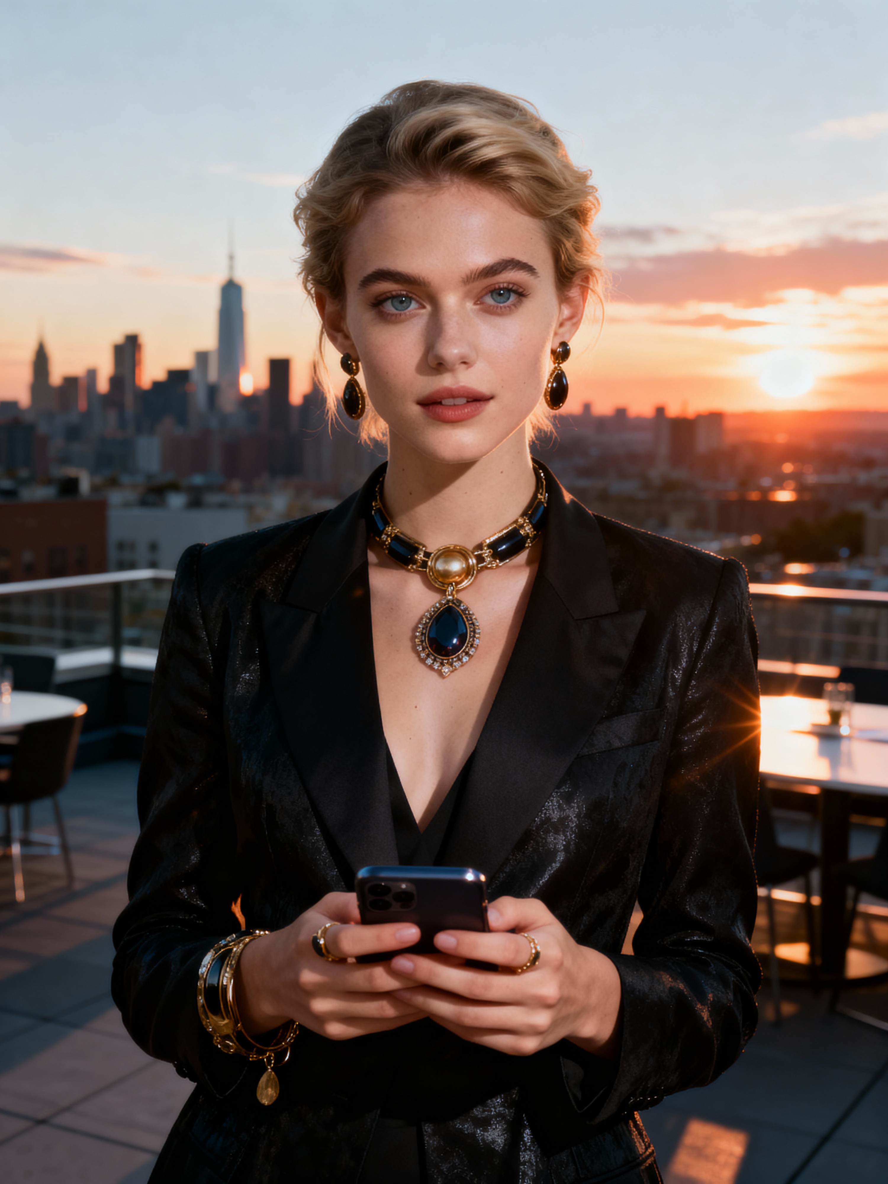 inspiring model wearing sophisticated yet trendy outfit with statement accessories with smartphone, urban rooftop meeting space, skyline background, sunset lighting