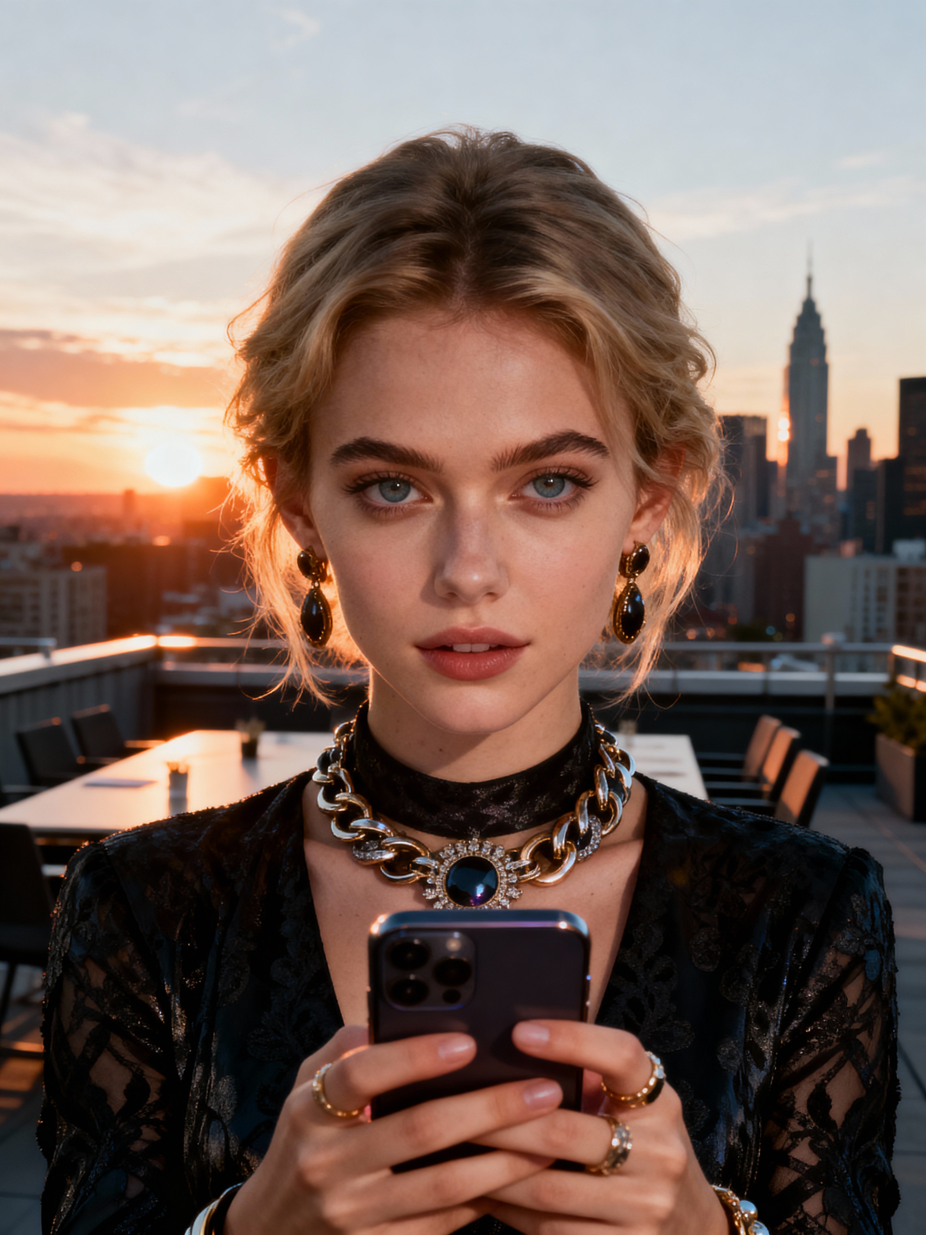 inspiring model wearing sophisticated yet trendy outfit with statement accessories with smartphone, urban rooftop meeting space, skyline background, sunset lighting