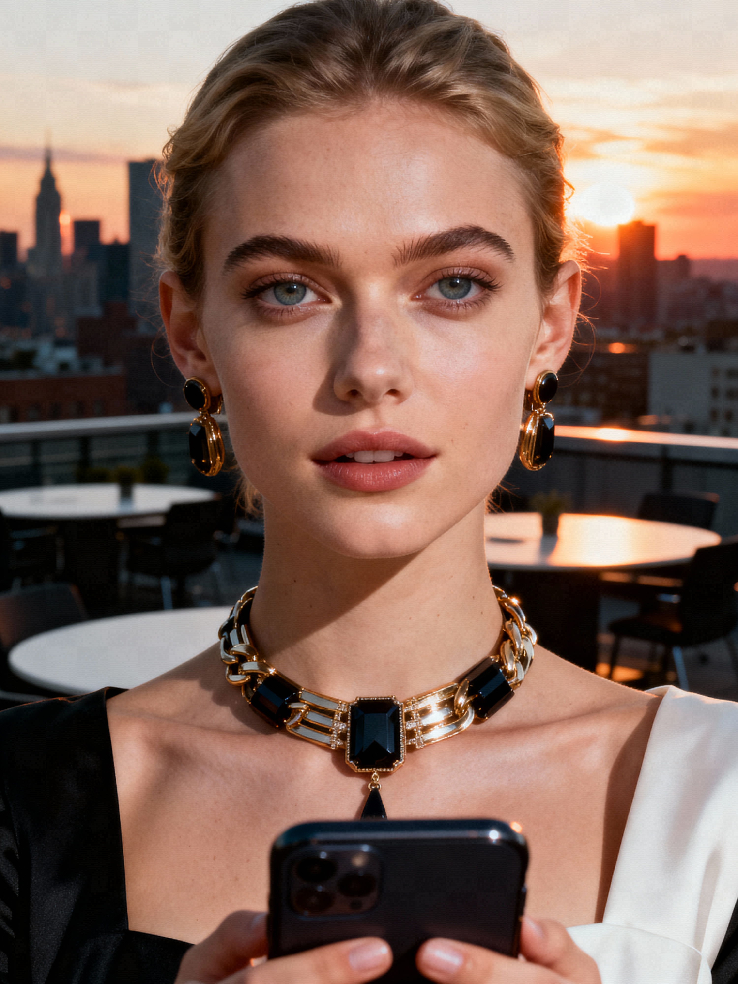 inspiring model wearing sophisticated yet trendy outfit with statement accessories with smartphone, urban rooftop meeting space, skyline background, sunset lighting