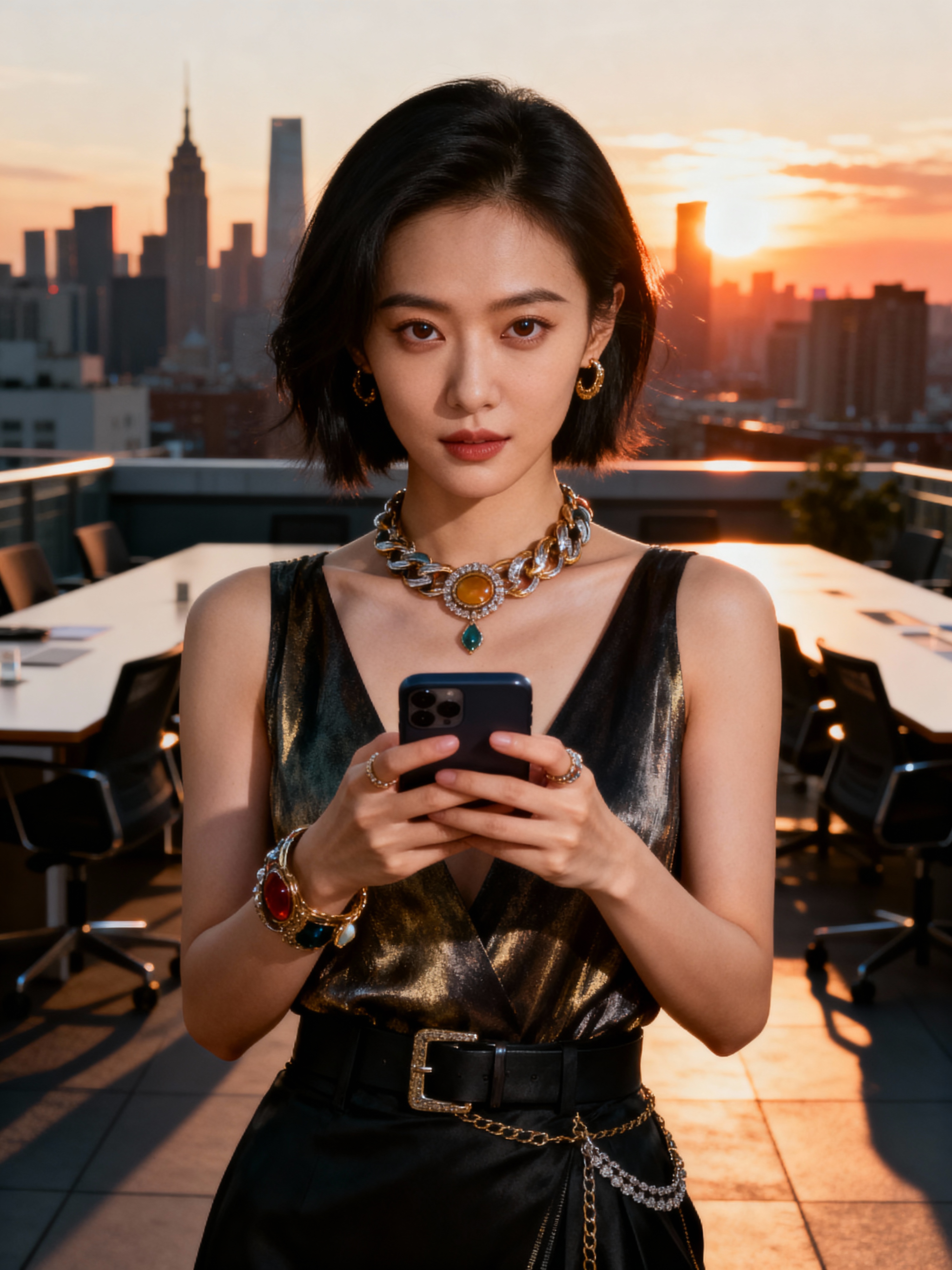 inspiring model wearing sophisticated yet trendy outfit with statement accessories with smartphone, urban rooftop meeting space, skyline background, sunset lighting