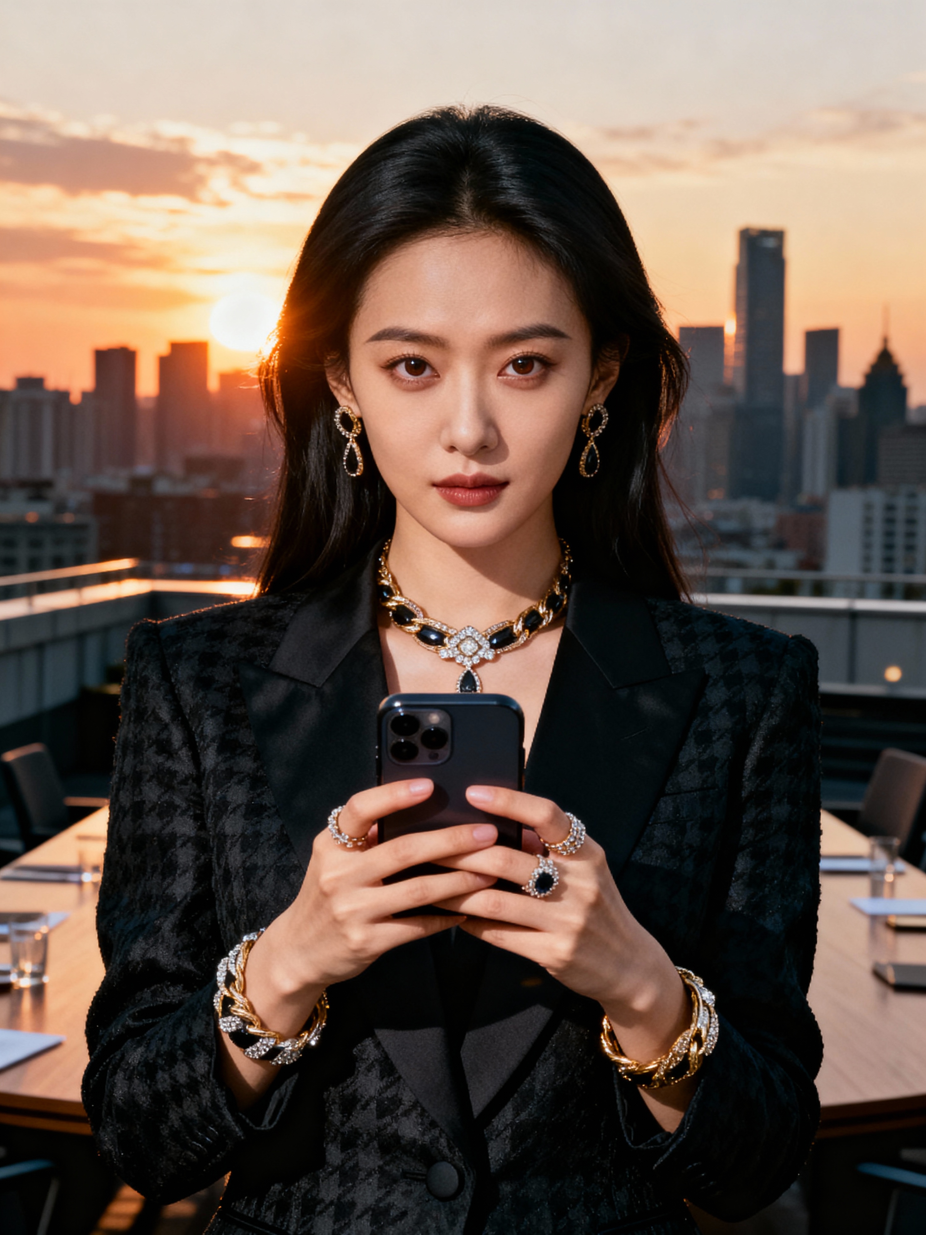 inspiring model wearing sophisticated yet trendy outfit with statement accessories with smartphone, urban rooftop meeting space, skyline background, sunset lighting