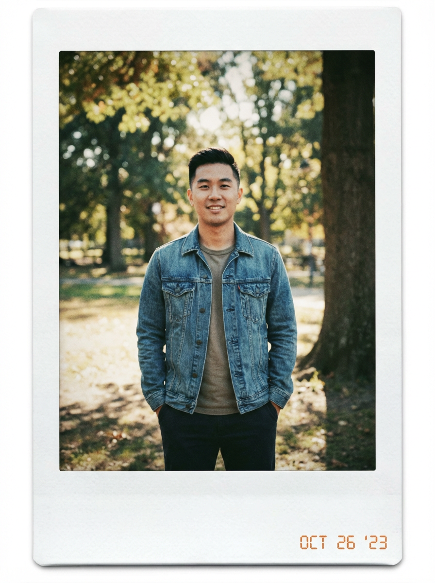 instant polaroid style photo of model in instant classic photograph posing for photo outside