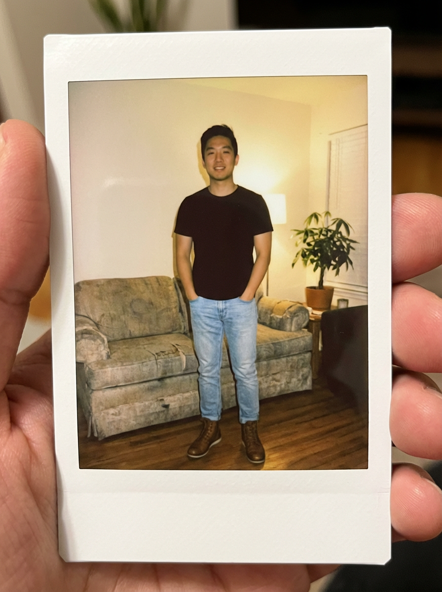 instant polaroid style photo of model in instant classic photograph posing for photo indoors