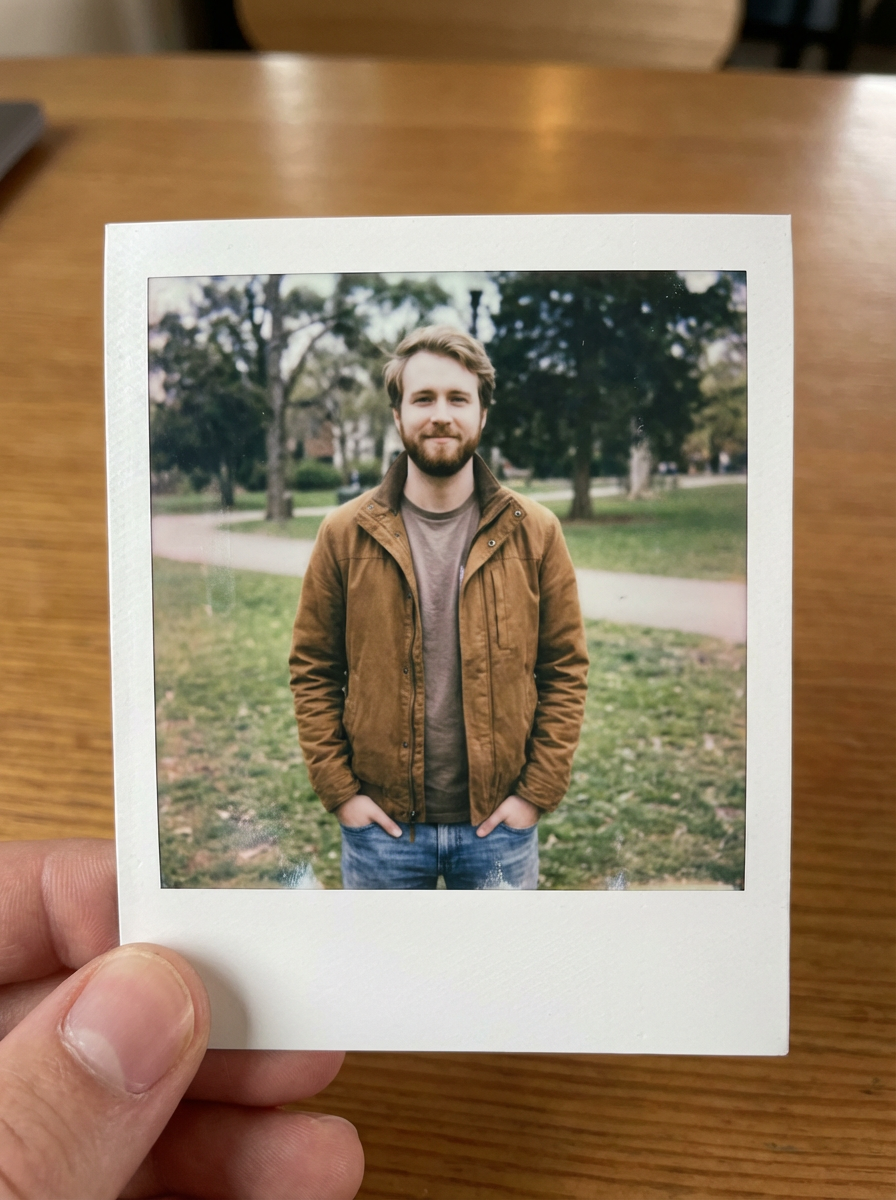 instant polaroid style photo of model in instant classic photograph posing for photo outside