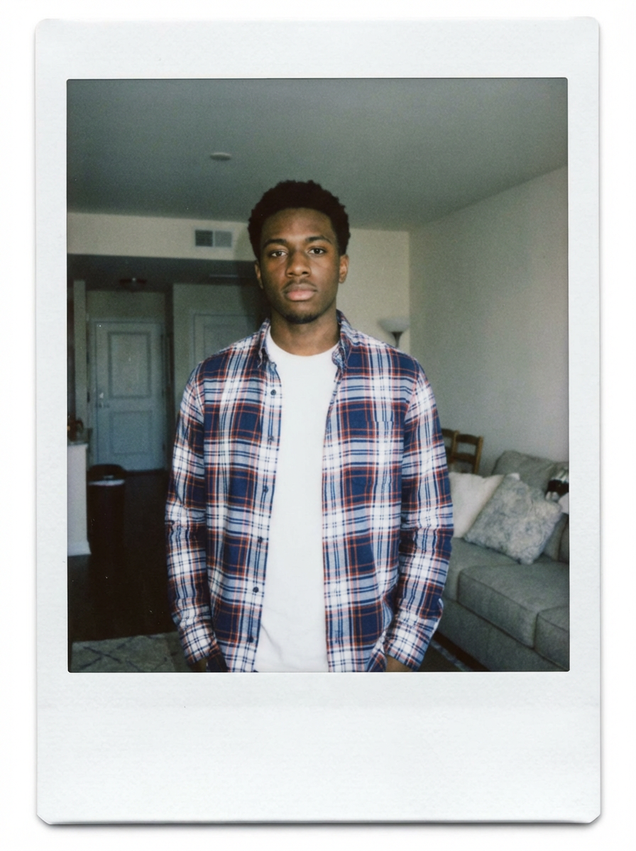 instant polaroid style photo of model in instant classic photograph posing for photo indoors