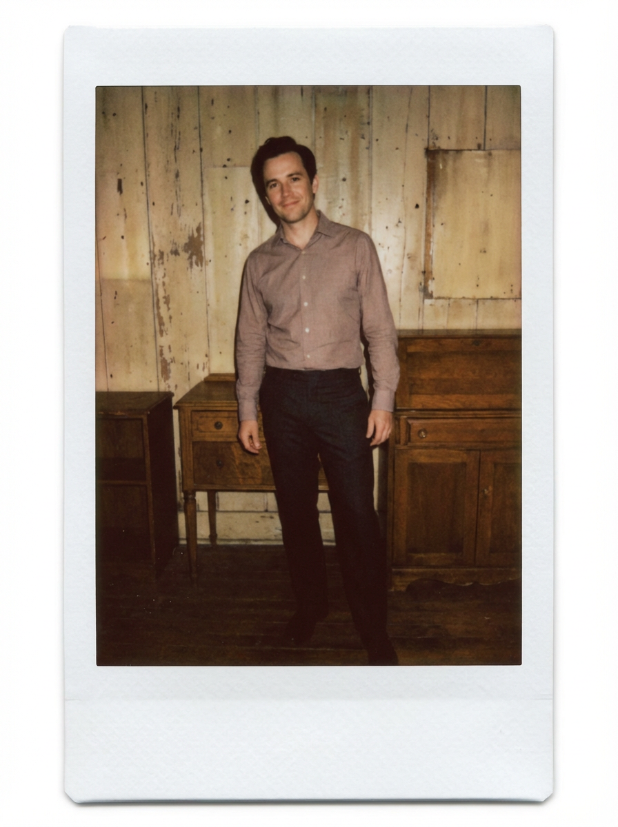 instant polaroid style photo of model in instant classic photograph posing for photo indoors