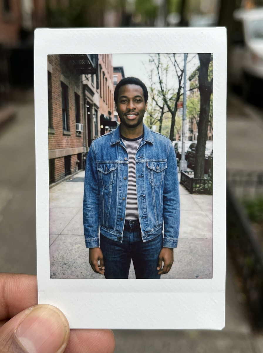 instant polaroid style photo of model in instant classic photograph posing for photo outside