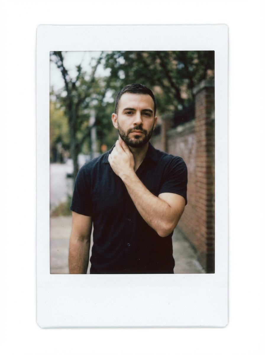 instant polaroid style photo of model in instant classic photograph posing for photo outside