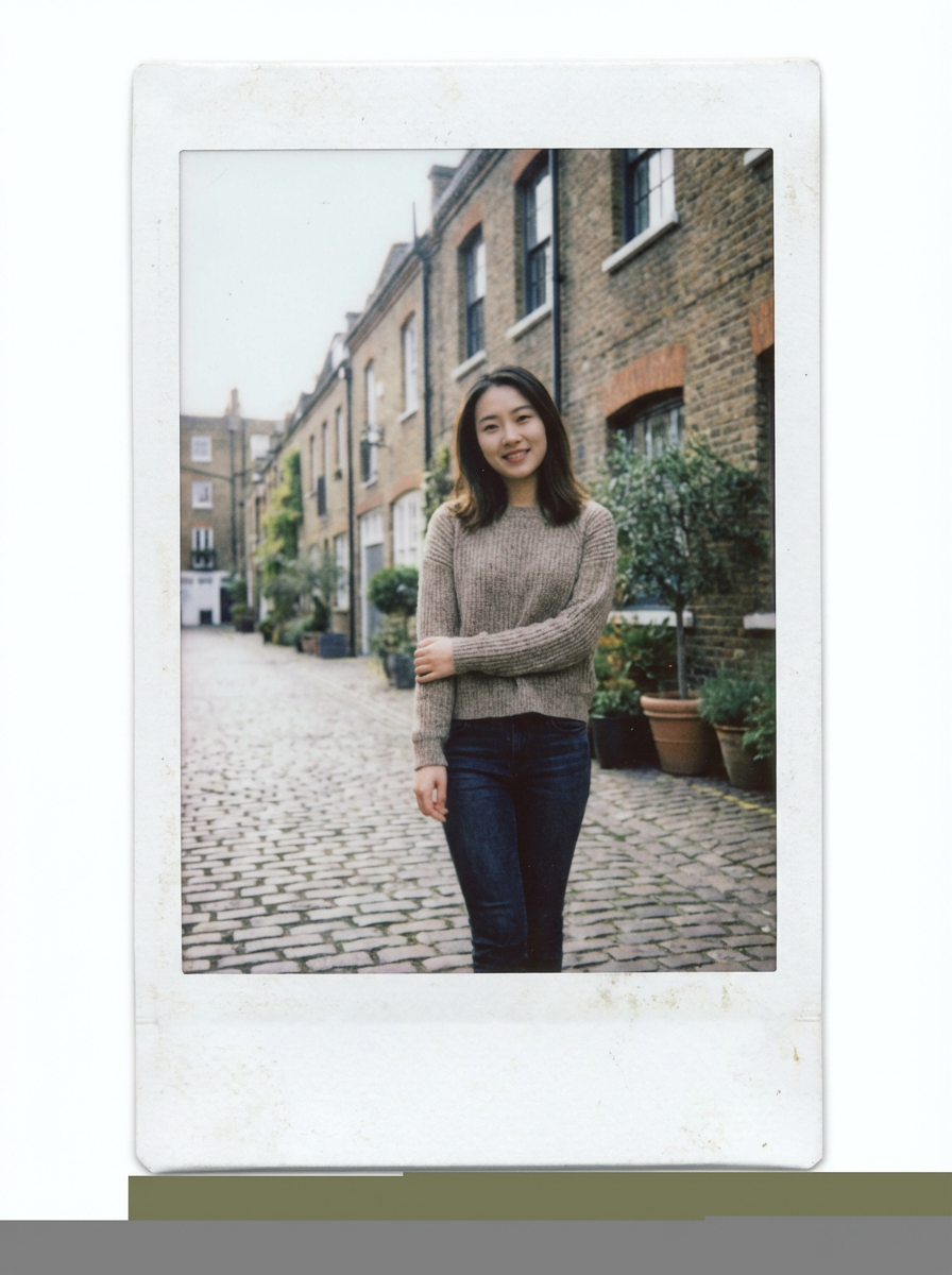 instant polaroid style photo of model in instant classic photograph posing for photo outside
