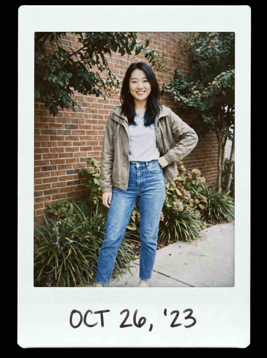 instant polaroid style photo of model in instant classic photograph posing for photo outside