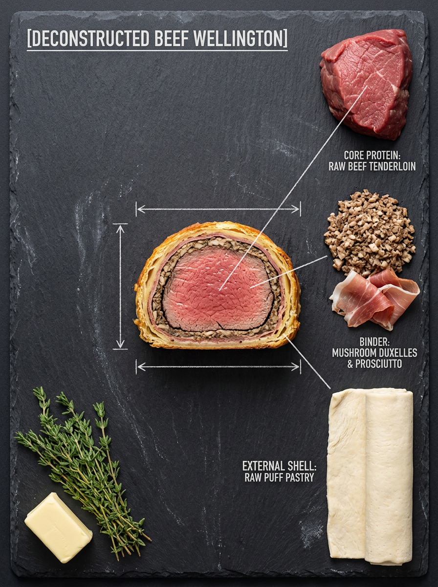 1. Analyze Input Variable: Input A is a Multi-Layered Dish Deconstruction (The Hierarchy): The Core (Layer 1):Identify the absolute center component (e.g., The Meat, The Filling, The Fish). The Binder (Layer 2):Identify the surrounding layer (e.g., The Cheese/Sauce, The Rice, The Frosting). The Shell (Layer 3):Identify the outermost structure (e.g., The Bread, The Nori, The Pastry, The Crust). The Raw State:Visualize these three specific components in their raw, uncooked form. 2. The Container (The Blueprint Board): Surface:Dark Grey Natural Slateor Black Chalkboard with chipped edges. Camera:Strict Orthographic Top-Down (90 Degrees).Flat lay. Layout:"Knolling" style. Organized grid with negative space. 3. The Composition: CRITICAL:Follow this strict placement logic to ensure the lines don't cross. Center:A single, pristine Cross-Section Sliceof the cooked dish. The layers must be distinct and . Right Column (The Raw Materials):Arrange the raw ingredients vertically, aligned to the right edge. Top Satellite:The Raw "Core" Ingredient (e.g., Raw Beef, Raw Tuna). Middle Satellite:The Raw "Binder" Ingredient (e.g., Sliced Cheese, Rice, Mushrooms). Bottom Satellite:The Raw "Shell" Ingredient (e.g., Flour Mound, Bread Slice, Nori Sheet). Bottom Left Corner:A secondary view or garnish (e.g., Whole Herbs, Butter Block). 4. Visual Syntax: The Lines:Thin, white Chalk-Style Leader Lines must connect the Raw Satellites to their specific destination in the Center Slice. Strict Geometry Rules: Line A:Connects the Top Satellite (Core)$\rightarrow$ directly to the Geometric Center of the slice. Line B:Connects the Middle Satellite (Binder)$\rightarrow$ to the Ring/Layer surrounding the center. Line C:Connects the Bottom Satellite (Shell)$\rightarrow$ to the Outer Edge/Crust of the slice. The Graphics: Add dimension arrows measuring width and height. The Text: Header:Underlined Title "[Input A]" (Top Left). Labels: Clean sans-serif text naming the ingredients (e.g., "CORE PROTEIN," "EXTERNAL SHELL"). 5. Textural Fidelity: Contrast: The Center Slice must look Cooked/Finished(moist, textures integrated). The Satellites must look Raw/Deconstructed(matte, separated). Chalk Dust: Subtle white powder residue on the slate. Output:ONE image, 1:1 Aspect Ratio, 8k Resolution, "Infographic" aesthetic, High Contrast.