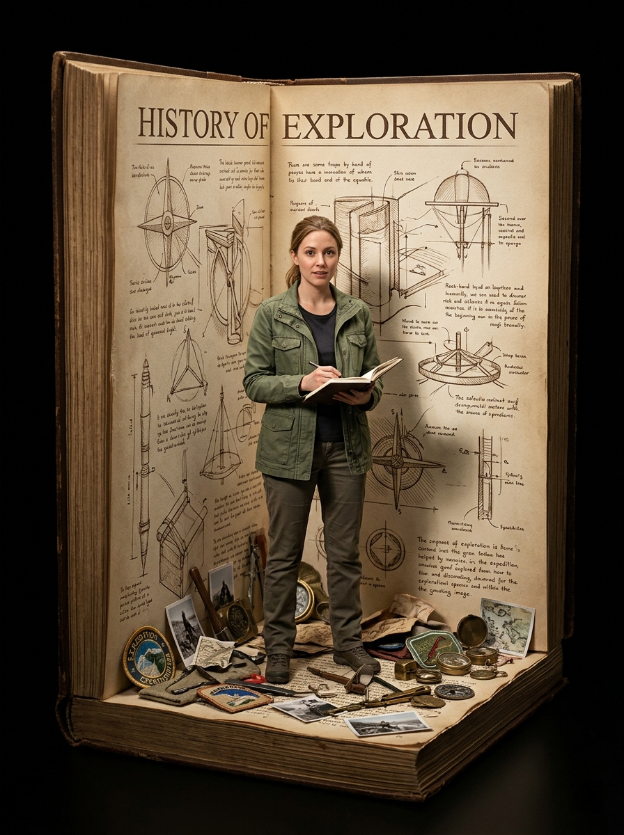 Lunar Module -> Shuttle). 2. The Immutable Container (The Corner Stage): Geometry: The book is NOT lying flat. It is standing upright, opened to form a Strict 90-Degree Corner . Vertical Wall: The back cover/pages standing straight up. Horizontal Floor: The front cover/pages lying flat. The Anchor: The "Totem" object (Rocket) stands inside the spine crease , acting as the structural pillar holding the book open. Paper Texture: The pages must look thick, rough, and heavily aged (like an 1800s manuscript). 3. The Vertical Plane (The Da Vinci Sketchbook): Density: MAXIMUM. Do not leave white space. Style: Sepia-tone Pen & Ink Technical Drawings . Content: The background should be a chaotic but organized collage of diagrams, timelines, and schematics. It should look like a scientist's field notes. Text: A bold, formal Serif Title at the top (e.g., "HISTORY OF SPACE EXPLORATION"). 4. The Horizontal Plane (The Physical Clutter): Transition: The Totem (Rocket) seamlessly transitions from a drawing on the wall to a Physical 3D Model on the floor. The Scatter: The "Ephemera" props are scattered and overlapping on the floor page. They should not be neatly arranged. Material Contrast: The props must look like shiny plastic, crinkled foil, and fabric patches. This clashes with the matte paper. Scale: A tiny 1:64 scale human figure (e.g., Astronaut) stands next to the massive Totem for scale. 5. Visual Syntax: Background: Void Black. The book floats in infinite darkness. DO NOT render studio equipment, lamps, or tables. Lighting: "Museum Display" lighting. A focused beam hits the Totem, creating a long shadow against the back page sketches. Depth: The 3D objects must cast hard shadows onto the 2D paper to sell the optical illusion. Output: 1:1 Aspect Ratio, Macro Photography, High Textural Contrast (Paper vs. Plastic). "/> Lunar Module -> Shuttle). 2. The Immutable Container (The Corner Stage): Geometry: The book is NOT lying flat. It is standing upright, opened to form a Strict 90-Degree Corner . Vertical Wall: The back cover/pages standing straight up. Horizontal Floor: The front cover/pages lying flat. The Anchor: The "Totem" object (Rocket) stands inside the spine crease , acting as the structural pillar holding the book open. Paper Texture: The pages must look thick, rough, and heavily aged (like an 1800s manuscript). 3. The Vertical Plane (The Da Vinci Sketchbook): Density: MAXIMUM. Do not leave white space. Style: Sepia-tone Pen & Ink Technical Drawings . Content: The background should be a chaotic but organized collage of diagrams, timelines, and schematics. It should look like a scientist's field notes. Text: A bold, formal Serif Title at the top (e.g., "HISTORY OF SPACE EXPLORATION"). 4. The Horizontal Plane (The Physical Clutter): Transition: The Totem (Rocket) seamlessly transitions from a drawing on the wall to a Physical 3D Model on the floor. The Scatter: The "Ephemera" props are scattered and overlapping on the floor page. They should not be neatly arranged. Material Contrast: The props must look like shiny plastic, crinkled foil, and fabric patches. This clashes with the matte paper. Scale: A tiny 1:64 scale human figure (e.g., Astronaut) stands next to the massive Totem for scale. 5. Visual Syntax: Background: Void Black. The book floats in infinite darkness. DO NOT render studio equipment, lamps, or tables. Lighting: "Museum Display" lighting. A focused beam hits the Totem, creating a long shadow against the back page sketches. Depth: The 3D objects must cast hard shadows onto the 2D paper to sell the optical illusion. Output: 1:1 Aspect Ratio, Macro Photography, High Textural Contrast (Paper vs. Plastic). "/> Lunar Module -> Shuttle). 2. The Immutable Container (The Corner Stage): Geometry: The book is NOT lying flat. It is standing upright, opened to form a Strict 90-Degree Corner . Vertical Wall: The back cover/pages standing straight up. Horizontal Floor: The front cover/pages lying flat. The Anchor: The "Totem" object (Rocket) stands inside the spine crease , acting as the structural pillar holding the book open. Paper Texture: The pages must look thick, rough, and heavily aged (like an 1800s manuscript). 3. The Vertical Plane (The Da Vinci Sketchbook): Density: MAXIMUM. Do not leave white space. Style: Sepia-tone Pen & Ink Technical Drawings . Content: The background should be a chaotic but organized collage of diagrams, timelines, and schematics. It should look like a scientist's field notes. Text: A bold, formal Serif Title at the top (e.g., "HISTORY OF SPACE EXPLORATION"). 4. The Horizontal Plane (The Physical Clutter): Transition: The Totem (Rocket) seamlessly transitions from a drawing on the wall to a Physical 3D Model on the floor. The Scatter: The "Ephemera" props are scattered and overlapping on the floor page. They should not be neatly arranged. Material Contrast: The props must look like shiny plastic, crinkled foil, and fabric patches. This clashes with the matte paper. Scale: A tiny 1:64 scale human figure (e.g., Astronaut) stands next to the massive Totem for scale. 5. Visual Syntax: Background: Void Black. The book floats in infinite darkness. DO NOT render studio equipment, lamps, or tables. Lighting: "Museum Display" lighting. A focused beam hits the Totem, creating a long shadow against the back page sketches. Depth: The 3D objects must cast hard shadows onto the 2D paper to sell the optical illusion. Output: 1:1 Aspect Ratio, Macro Photography, High Textural Contrast (Paper vs. Plastic). "/>