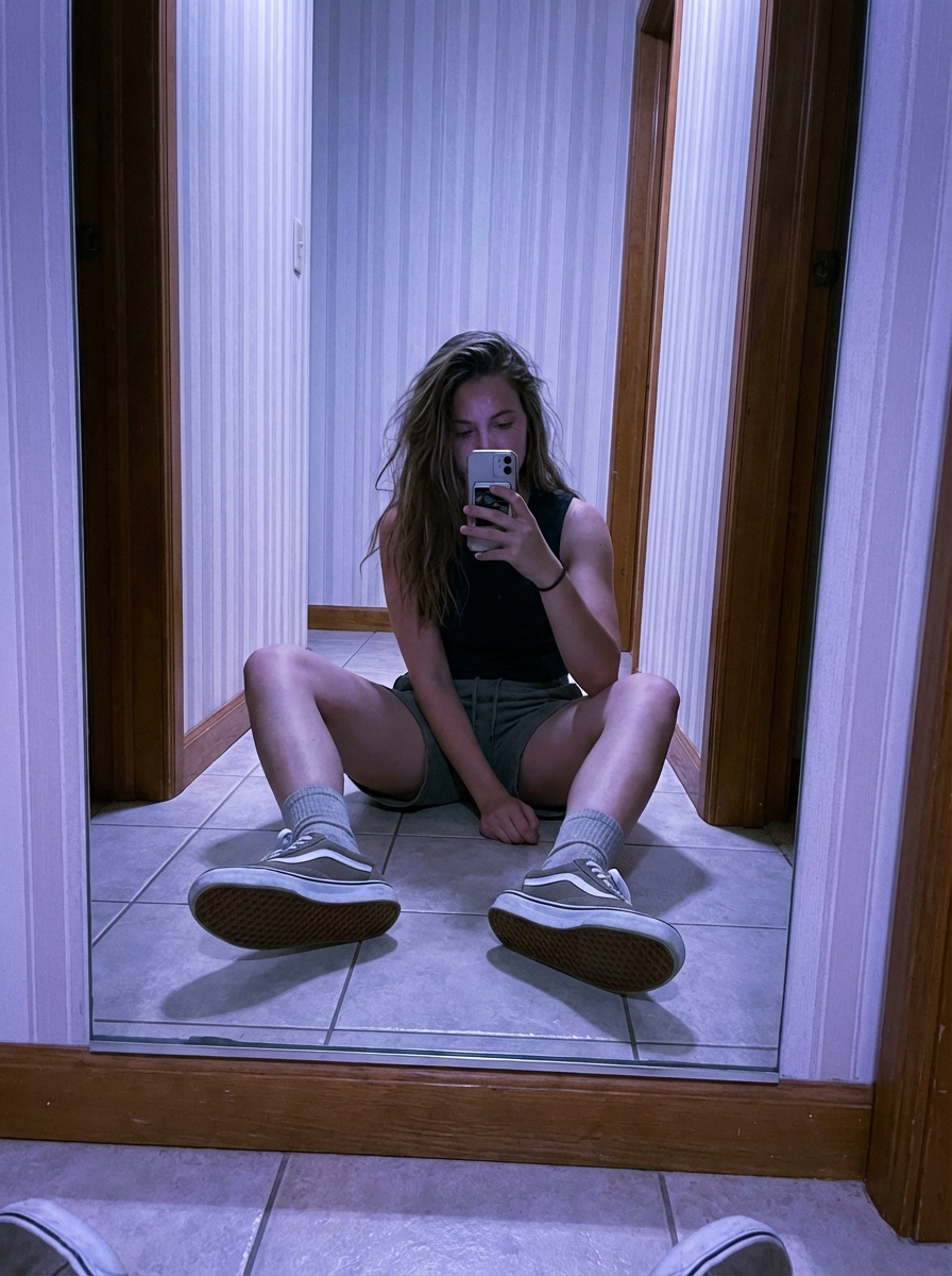 {"intent": "Generate a photorealistic, candid mirror selfie with a casual, modern social-media aesthetic.", "style": {"primary": "photorealistic contemporary lifestyle photography", "lighting": "soft indoor lighting with a cool purple-blue tint, gentle shadows along the walls", "mood": "casual, confident, slightly playful everyday moment", "technical": {"camera_type": "smartphone, handheld", "lens_look": "wide-angle perspective similar to 24–28mm", "camera_position": "low floor-level position", "depth_of_field": "natural depth with mild wide-angle distortion from close proximity", "imperfections": "subtle film grain, minor noise, realistic handheld framing"}, "materials": {"skin": "natural skin texture with subtle imperfections, realistic tone and detail", "hair": "long hair worn loose and slightly tousled, softly catching ambient indoor light without specifying color", "clothing": "simple, casual outfit with clean fabric highlights and natural folds", "environment_surfaces": "tiled floor, reflective mirror surface, wallpapered walls, wooden trim"}}, "frame": {"aspect_ratio": "9:16 vertical", "composition": "low-angle mirror selfie with strong foreground emphasis from extended legs and footwear", "perspective": "pronounced foreshortening from feet closest to the camera"}, "subject": {"identity": {"face": {"preserve_original": true}, "body": {"preserve_original": true}}, "pose": {"position": "seated on a tiled floor in a narrow hallway", "legs": "extended toward the camera, creating strong foreshortening", "upper_body": "torso upright but relaxed, shoulders natural", "hands": "holding a smartphone up toward the mirror to take the photo"}, "expression": "casual and confident; phone partially covers the face so only the eyes and brows are visible", "wardrobe": {"top": "simple sleeveless tank-style top with a relaxed fit", "bottom": "casual shorts", "footwear": "low-profile sneakers with crew socks", "overall": "clean, everyday casual outfit without stylization"}}, "environment": {"location": "indoor narrow hallway", "background_elements": ["vertical striped wallpaper", "wooden trim along the walls", "full-length mirror reflecting the subject"], "lighting_details": {"color_tone": "cool purple-blue ambient tint", "shadow_quality": "soft, subtle shadows along walls and floor"}}, "quality": {"resolution": "high detail suitable for modern social-media viewing", "sharpness": "sharp focus on the subject and foreground footwear, mirror reflection clear", "post_processing": "minimal edits, natural contrast, realistic color balance", "avoid": ["over-smoothed or plastic skin", "studio or artificial-looking lighting", "cartoon or anime styles", "distorted anatomy or extra limbs", "text, logos, or watermarks"]}, "priority_notes": ["match the face and body exactly to the provided reference image", "maintain a candid, unposed mirror-selfie feel", "avoid specifying hair color, eye color, or unique identifying marks"]}