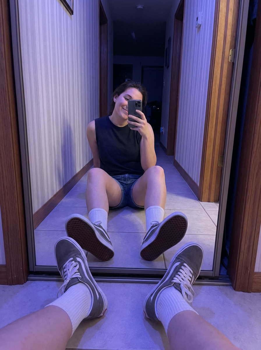 {"intent": "Generate a photorealistic, candid mirror selfie with a casual, modern social-media aesthetic.", "style": {"primary": "photorealistic contemporary lifestyle photography", "lighting": "soft indoor lighting with a cool purple-blue tint, gentle shadows along the walls", "mood": "casual, confident, slightly playful everyday moment", "technical": {"camera_type": "smartphone, handheld", "lens_look": "wide-angle perspective similar to 24–28mm", "camera_position": "low floor-level position", "depth_of_field": "natural depth with mild wide-angle distortion from close proximity", "imperfections": "subtle film grain, minor noise, realistic handheld framing"}, "materials": {"skin": "natural skin texture with subtle imperfections, realistic tone and detail", "hair": "long hair worn loose and slightly tousled, softly catching ambient indoor light without specifying color", "clothing": "simple, casual outfit with clean fabric highlights and natural folds", "environment_surfaces": "tiled floor, reflective mirror surface, wallpapered walls, wooden trim"}}, "frame": {"aspect_ratio": "9:16 vertical", "composition": "low-angle mirror selfie with strong foreground emphasis from extended legs and footwear", "perspective": "pronounced foreshortening from feet closest to the camera"}, "subject": {"identity": {"face": {"preserve_original": true}, "body": {"preserve_original": true}}, "pose": {"position": "seated on a tiled floor in a narrow hallway", "legs": "extended toward the camera, creating strong foreshortening", "upper_body": "torso upright but relaxed, shoulders natural", "hands": "holding a smartphone up toward the mirror to take the photo"}, "expression": "casual and confident; phone partially covers the face so only the eyes and brows are visible", "wardrobe": {"top": "simple sleeveless tank-style top with a relaxed fit", "bottom": "casual shorts", "footwear": "low-profile sneakers with crew socks", "overall": "clean, everyday casual outfit without stylization"}}, "environment": {"location": "indoor narrow hallway", "background_elements": ["vertical striped wallpaper", "wooden trim along the walls", "full-length mirror reflecting the subject"], "lighting_details": {"color_tone": "cool purple-blue ambient tint", "shadow_quality": "soft, subtle shadows along walls and floor"}}, "quality": {"resolution": "high detail suitable for modern social-media viewing", "sharpness": "sharp focus on the subject and foreground footwear, mirror reflection clear", "post_processing": "minimal edits, natural contrast, realistic color balance", "avoid": ["over-smoothed or plastic skin", "studio or artificial-looking lighting", "cartoon or anime styles", "distorted anatomy or extra limbs", "text, logos, or watermarks"]}, "priority_notes": ["match the face and body exactly to the provided reference image", "maintain a candid, unposed mirror-selfie feel", "avoid specifying hair color, eye color, or unique identifying marks"]}