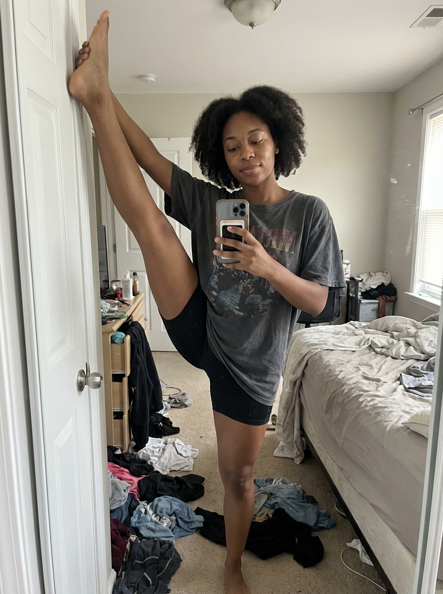 {"intent": "Generate a photorealistic, high-fidelity mirror selfie of a young model performing an athletic pose in a naturally messy bedroom. Preserve all facial features strictly from the reference portrait provided.", "frame": {"aspect_ratio": "9:16 vertical", "composition": "Full-body mirror selfie with the subject centered. The frame captures both the pose and the surrounding room clutter in a natural social-media style.", "style_mode": "raw_lifestyle, candid_mobile_photography, authentic_selfie"}, "subject": {"identity": "Use the exact face, hair, and physical traits from the reference influencer image. No changes to facial structure.", "hair": "match reference image; natural, loose, slightly unstyled appearance", "wardrobe": {"top": "loose, comfortable t-shirt with a simple cute graphic", "bottom": "basic athletic shorts"}, "makeup": "minimal, natural, everyday look", "pose": "vertical standing split performed in front of a mirror, holding a smartphone in one hand to capture the selfie. One leg is raised upward along the door frame, body balanced on the other leg.", "expression": "relaxed, genuine, casual expression as if capturing a spontaneous moment"}, "environment": {"location": "lived-in personal bedroom", "architecture": "plain residential interior with light walls and a standard door frame", "props_and_details": ["clothes scattered loosely on the floor", "unmade bed with creased sheets", "cluttered surfaces such as dresser or chairs", "small household items adding to the realistic casualness"], "atmosphere": "unfiltered, cozy, naturally messy"}, "lighting": {"type": "soft naturalistic indoor lighting", "source": "daylight coming through a nearby window mixed with ambient room light", "color_temperature": "neutral, around 4500K", "shadows": "soft, low-contrast shadows consistent with natural home lighting", "contrast": "balanced, keeping both subject and messy room visible"}, "camera": {"sensor_format": "mobile phone main camera simulation", "lens": "wide-angle ~24mm equivalent", "aperture_depth_of_field": "shallow enough to keep subject sharp while softly blurring background clutter", "camera_position": "handheld at eye level in mirror reflection", "shutter_speed": "fast enough to freeze motion", "iso": "low noise, clean image"}, "negative": {"content": ["no heavy makeup", "no stylized editorial look", "no clean or minimalist room", "no dramatic lighting", "no studio environment"], "style": ["no excessive smoothing", "no plastic skin look", "no glam filter", "no artificial airbrush effects"]}}