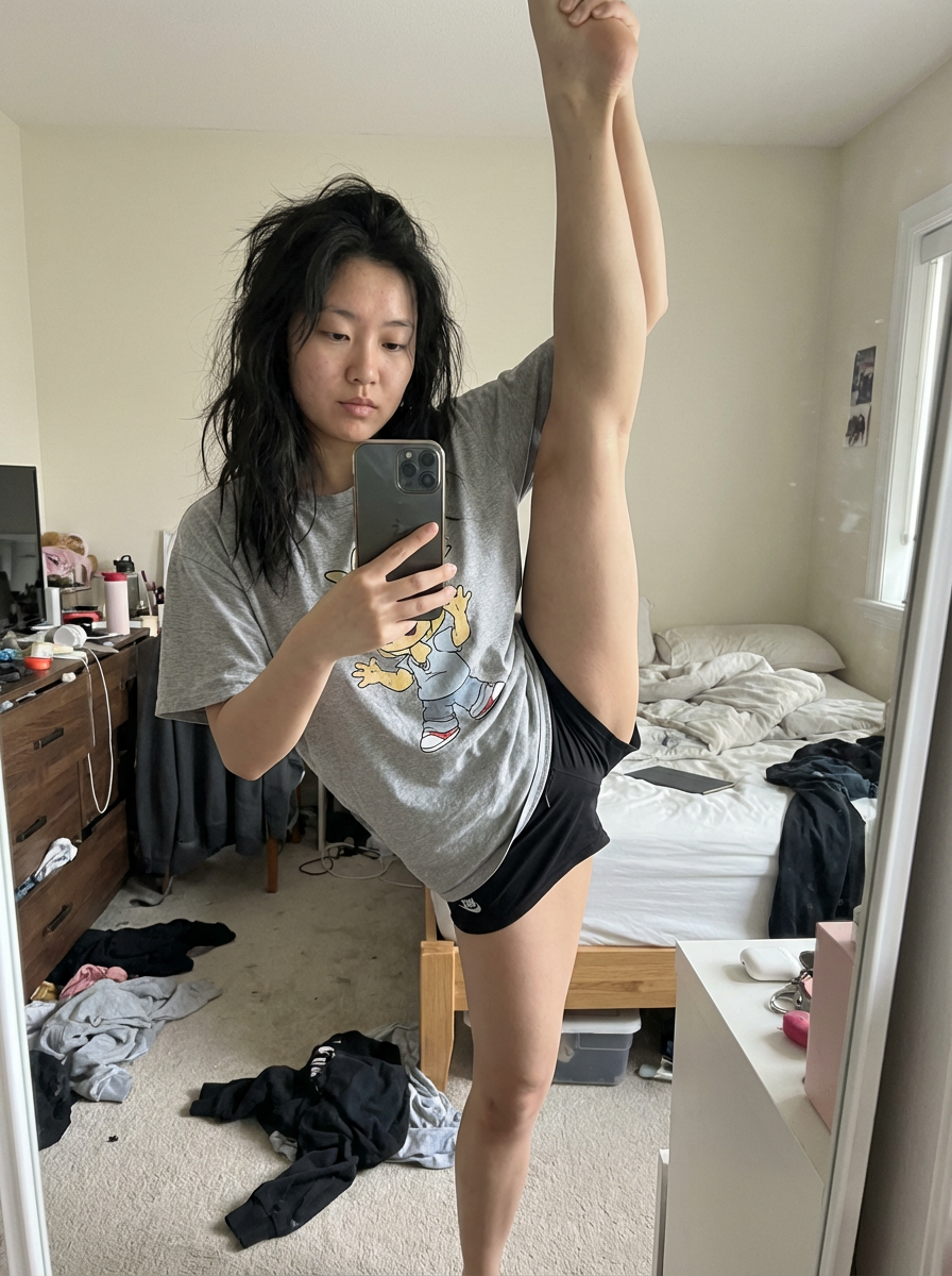 {"intent": "Generate a photorealistic, high-fidelity mirror selfie of an Eastern with natural features performing an athletic pose in a disordered bedroom.", "frame": {"aspect_ratio": "9:16 vertical", "composition": "Full-body vertical framing suitable for social media stories, centering the subject's standing split reflection amidst domestic clutter.", "style_mode": "raw_lifestyle, next_gen_mobile_photography, authentic_portraiture"}, "subject": {"identity": "A young model of Eastern, characterized by effortless, natural beauty. She possesses high cheekbones, with visible natural texture, and soft facial features.", "hair": "Naturally textured, voluminous, and slightly frizzy hair worn loose, appearing unstyled and authentically messy.", "wardrobe": "A loose-fitting, comfortable t-shirt featuring a cute, centered graphic illustration (such as a character or mascot). She wears simple athletic shorts.", "makeup": "Bare-faced aesthetic with no visible makeup. The skin shows natural imperfections, freckles, and a healthy, unenhanced complexion, contrasting with the previous glamour style.", "pose": "The subject performs a vertical standing split in the mirror, balancing on one leg while the other extends straight up towards the top of the door frame. She holds an iPhone 17 Pro Max in one hand to capture the shot.", "interaction": "The subject's expression is relaxed and genuine, reflecting a casual, private moment of flexibility practice."}, "environment": {"location": "A chaotic, lived-in personal bedroom.", "architecture": "Standard residential interior with walls and a door frame.", "props_and_details": "The background is untidy and realistic, featuring clothes strewn across the floor, an unmade bed with rumpled sheets, and general personal clutter on surfaces, reinforcing the candid nature of the image.", "atmosphere": "Casual, domestic, and unfiltered."}, "lighting": {"type": "Naturalistic mixed lighting.", "source": "Soft daylight filtering through a window combined with ambient room lighting.", "color_temperature": "Neutral to slightly warm (approx. 4500K), rendering skin tones accurately without artificial color casts.", "shadows": "Soft, natural shadows falling across the room's clutter, with no dramatic or theatrical contrast.", "contrast": "Balanced and life-like, preserving detail in both the bright highlights of the phone reflection and the darker areas of the messy room."}, "camera": {"sensor_format": "Simulated next-generation mobile sensor (iPhone 17 Pro Max profile).", "lens": "24mm equivalent wide-angle main lens.", "aperture_depth_of_field": "f/1.8 simulation, keeping the subject in sharp focus while allowing the messy background to fall slightly out of focus.", "camera_position": "Handheld at eye level relative to the mirror.", "shutter_speed": "1/100s, sharp and crisp.", "iso": "ISO 100, clean and noise-free image quality."}, "negative": {"content": "No heavy makeup, no lipstick , no eyeliner , no contouring , no studio lighting, no tidy room, no minimalist background, no denim.", "style": "No airbrushing, no glamour filter, no plastic skin, no over-editing, no artificial smoothness."}}