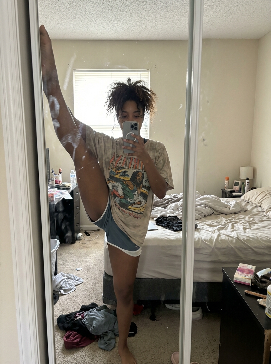 {"intent": "Generate a photorealistic, high-fidelity mirror selfie of an Eastern with natural features performing an athletic pose in a disordered bedroom.", "frame": {"aspect_ratio": "9:16 vertical", "composition": "Full-body vertical framing suitable for social media stories, centering the subject's standing split reflection amidst domestic clutter.", "style_mode": "raw_lifestyle, next_gen_mobile_photography, authentic_portraiture"}, "subject": {"identity": "A young model of Eastern, characterized by effortless, natural beauty. She possesses high cheekbones, with visible natural texture, and soft facial features.", "hair": "Naturally textured, voluminous, and slightly frizzy hair worn loose, appearing unstyled and authentically messy.", "wardrobe": "A loose-fitting, comfortable t-shirt featuring a cute, centered graphic illustration (such as a character or mascot). She wears simple athletic shorts.", "makeup": "Bare-faced aesthetic with no visible makeup. The skin shows natural imperfections, freckles, and a healthy, unenhanced complexion, contrasting with the previous glamour style.", "pose": "The subject performs a vertical standing split in the mirror, balancing on one leg while the other extends straight up towards the top of the door frame. She holds an iPhone 17 Pro Max in one hand to capture the shot.", "interaction": "The subject's expression is relaxed and genuine, reflecting a casual, private moment of flexibility practice."}, "environment": {"location": "A chaotic, lived-in personal bedroom.", "architecture": "Standard residential interior with walls and a door frame.", "props_and_details": "The background is untidy and realistic, featuring clothes strewn across the floor, an unmade bed with rumpled sheets, and general personal clutter on surfaces, reinforcing the candid nature of the image.", "atmosphere": "Casual, domestic, and unfiltered."}, "lighting": {"type": "Naturalistic mixed lighting.", "source": "Soft daylight filtering through a window combined with ambient room lighting.", "color_temperature": "Neutral to slightly warm (approx. 4500K), rendering skin tones accurately without artificial color casts.", "shadows": "Soft, natural shadows falling across the room's clutter, with no dramatic or theatrical contrast.", "contrast": "Balanced and life-like, preserving detail in both the bright highlights of the phone reflection and the darker areas of the messy room."}, "camera": {"sensor_format": "Simulated next-generation mobile sensor (iPhone 17 Pro Max profile).", "lens": "24mm equivalent wide-angle main lens.", "aperture_depth_of_field": "f/1.8 simulation, keeping the subject in sharp focus while allowing the messy background to fall slightly out of focus.", "camera_position": "Handheld at eye level relative to the mirror.", "shutter_speed": "1/100s, sharp and crisp.", "iso": "ISO 100, clean and noise-free image quality."}, "negative": {"content": "No heavy makeup, no lipstick , no eyeliner , no contouring , no studio lighting, no tidy room, no minimalist background, no denim.", "style": "No airbrushing, no glamour filter, no plastic skin, no over-editing, no artificial smoothness."}}