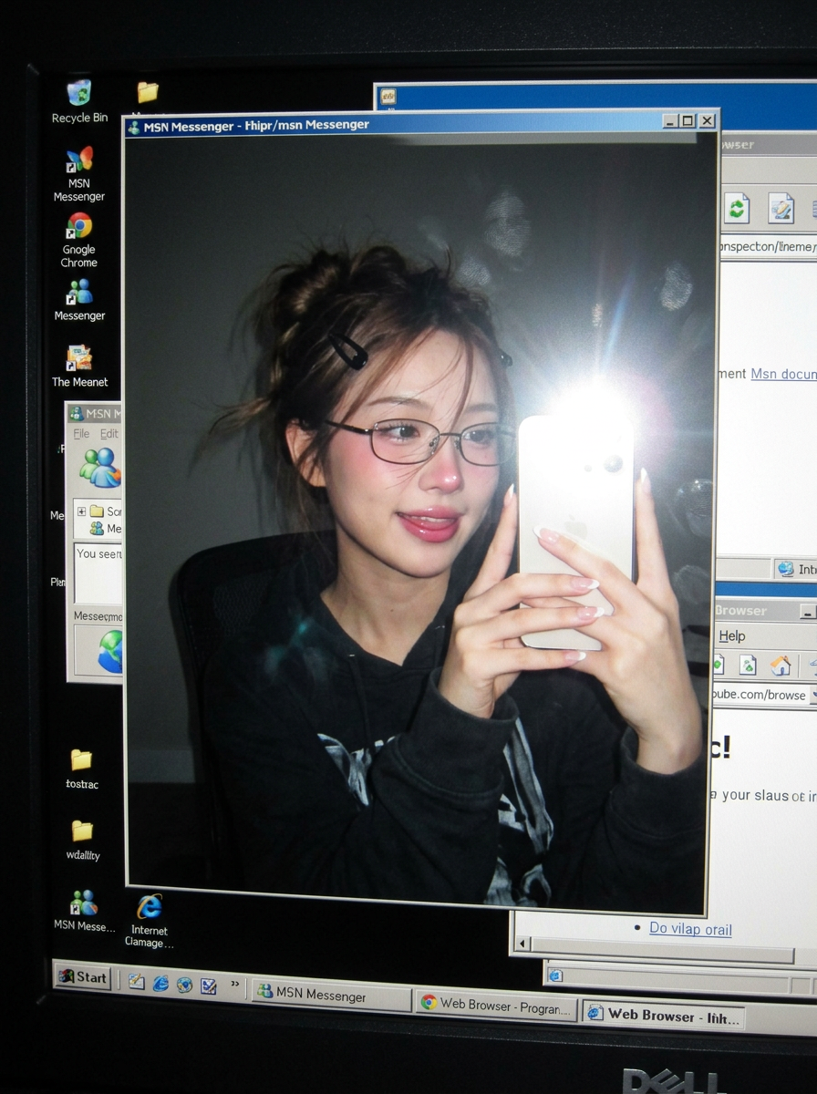 {"intent":"Daytime flash photograph with early-2000s Canon IXUS compact camera aesthetic","identity_preservation":{"instruction":"Keep the face and overall appearance 100% identical to the original reference. Do not edit, alter, or modify facial structure in any way."},"subject":{"type":"young model","pose":{"body_position":"sitting on a computer chair","action":"taking a selfie with an iPhone","gaze":"looking straight at the camera","expression":"cute, dreamy, innocent, playful, sweet smile with slightly quivering "},"appearance":{"facial_details":["pink cheeks","wearing glasses","cute facial expression"],"hair":{"style":"loose messy bun (dango style)","accessories":"black hair clips only","details":["some stray hairs slightly covering the face","hair flowing as if blown by wind","remove flower from ear","slightly messy layered look"],"vibe":"cool yet slightly sexy, effortless"},"makeup":{"style":"Douyin \/ Korean-inspired","details":["long curled eyelashes","pink blush on cheeks and nose tip","glossy pink lips with juicy, healthy look"]},"nails":"French-style manicured nails"},"clothing":{"instruction":"Clothing exactly as per the attached reference file"}},"scene":{"environment":{"location":"dark room","primary_visual":"only the image reflected on a computer or laptop screen is ","screen_details":["desktop icons ","taskbar ","multiple open program windows","early 2000s computer era interface look"],"screen_artifacts":["faint soft reflections","slight blur","fingerprints on the screen","light reflection from phone hitting the face"]}},"camera":{"device_style":"Canon IXUS digital compact camera (2000s era)","capture_style":"front-facing flash photo","resolution_style":"sharp but limited resolution typical of 2000s digital cameras","grain":"slight natural digital noise"},"lighting":{"type":"strong direct on-camera flash","characteristics":["very bright skin rendering","slight yellowish tint typical of compact cameras","hard shadows behind subject"]},"color_and_tone":{"temperature":"warm","palette":"pastel, soft tones","contrast":"vivid but not overly smooth"},"style_and_atmosphere":{"aesthetic":"early 2000s digital camera flash photography","mood":"cute, candid, playful","authenticity":"raw, realistic, unedited snapshot feel"},"constraints":["Do not change the face","Do not beautify excessively","No modern camera look","No studio lighting","No ultra-smooth skin"]}