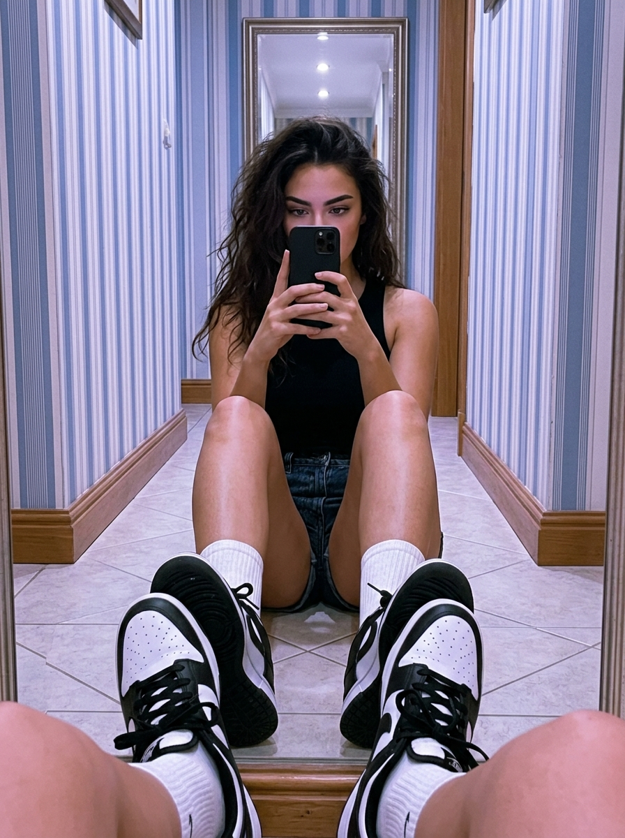 {"intent":"Generate a photorealistic, candid mirror selfie with a casual, modern social-media aesthetic.","style":{"primary":"photorealistic contemporary lifestyle photography","lighting":"soft indoor lighting with a cool purple-blue tint, gentle shadows along the walls","mood":"casual, confident, slightly playful everyday moment","technical":{"camera_type":"smartphone, handheld","lens_look":"wide-angle perspective similar to 24\u201328mm","camera_position":"low floor-level position","depth_of_field":"natural depth with mild wide-angle distortion from close proximity","imperfections":"subtle film grain, minor noise, realistic handheld framing"},"materials":{"skin":"natural skin texture with subtle imperfections, realistic tone and detail","hair":"long hair worn loose and slightly tousled, softly catching ambient indoor light without specifying color","clothing":"simple, casual outfit with clean fabric highlights and natural folds","environment_surfaces":"tiled floor, reflective mirror surface, wallpapered walls, wooden trim"}},"frame":{"aspect_ratio":"9:16 vertical","composition":"low-angle mirror selfie with strong foreground emphasis from extended legs and footwear","perspective":"pronounced foreshortening from feet closest to the camera"},"subject":{"identity":{"face":{"preserve_original":true},"body":{"preserve_original":true}},"pose":{"position":"seated on a tiled floor in a narrow hallway","legs":"extended toward the camera, creating strong foreshortening","upper_body":"torso upright but relaxed, shoulders natural","hands":"holding a smartphone up toward the mirror to take the photo"},"expression":"casual and confident; phone partially covers the face so only the eyes and brows are visible","wardrobe":{"top":"simple sleeveless tank-style top with a relaxed fit","bottom":"casual shorts","footwear":"low-profile sneakers with crew socks","overall":"clean, everyday casual outfit without stylization"}},"environment":{"location":"indoor narrow hallway","background_elements":["vertical striped wallpaper","wooden trim along the walls","full-length mirror reflecting the subject"],"lighting_details":{"color_tone":"cool purple-blue ambient tint","shadow_quality":"soft, subtle shadows along walls and floor"}},"quality":{"resolution":"high detail suitable for modern social-media viewing","sharpness":"sharp focus on the subject and foreground footwear, mirror reflection clear","post_processing":"minimal edits, natural contrast, realistic color balance","avoid":["over-smoothed or plastic skin","studio or artificial-looking lighting","cartoon or anime styles","distorted anatomy or extra limbs","text, logos, or watermarks"]},"priority_notes":["match the face and body exactly to the provided reference image","maintain a candid, unposed mirror-selfie feel","avoid specifying hair color, eye color, or unique identifying marks"]}