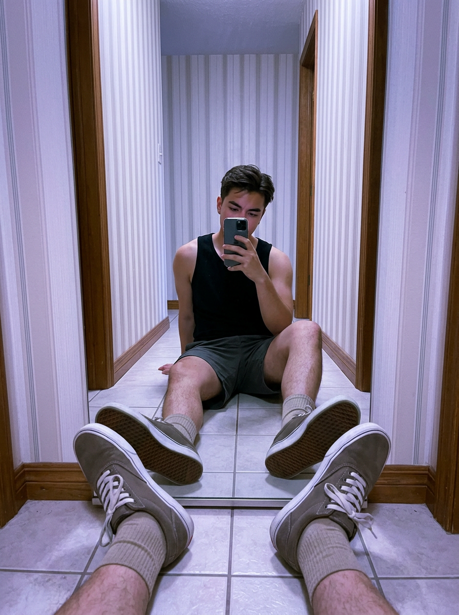 {"intent":"Generate a photorealistic, candid mirror selfie with a casual, modern social-media aesthetic.","style":{"primary":"photorealistic contemporary lifestyle photography","lighting":"soft indoor lighting with a cool purple-blue tint, gentle shadows along the walls","mood":"casual, confident, slightly playful everyday moment","technical":{"camera_type":"smartphone, handheld","lens_look":"wide-angle perspective similar to 24\u201328mm","camera_position":"low floor-level position","depth_of_field":"natural depth with mild wide-angle distortion from close proximity","imperfections":"subtle film grain, noise, realistic handheld framing"},"materials":{"skin":"natural skin texture with subtle imperfections, realistic tone and detail","hair":"short styled hair worn loose and slightly tousled, softly catching ambient indoor light specifying color","clothing":"simple, casual outfit with clean fabric highlights and natural folds","environment_surfaces":"tiled floor, reflective mirror surface, wallpapered walls, wooden trim"}},"frame":{"aspect_ratio":"9:16 vertical","composition":"low-angle mirror selfie with strong foreground emphasis from extended legs and footwear","perspective":"pronounced foreshortening from feet closest to the camera"},"subject":{"identity":{"face":{"preserve_original":true},"body":{"preserve_original":true}},"pose":{"position":"seated on a tiled floor in a narrow hallway","legs":"extended toward the camera, creating strong foreshortening","upper_body":" upright but relaxed, shoulders natural","hands":"holding a smartphone up toward the mirror to take the photo"},"expression":"casual and confident; phone partially covers the face so only the eyes and brows are ","wardrobe":{"top":"simple sleeveless tank top with a relaxed fit","bottom":"casual shorts","footwear":"low-profile sneakers with crew socks","overall":"clean, everyday casual outfit stylization"}},"environment":{"location":"indoor narrow hallway","background_elements":["vertical striped wallpaper","wooden trim along the walls","full-length mirror reflecting the subject"],"lighting_details":{"color_tone":"cool purple-blue ambient tint","shadow_quality":"soft, subtle shadows along walls and floor"}},"quality":{"resolution":"high detail suitable for modern social-media viewing","sharpness":"sharp focus on the subject and foreground footwear, mirror reflection clear","post_processing":"minimal edits, natural contrast, realistic color balance","avoid":["over-smoothed or plastic skin","studio or artificial-looking lighting","cartoon or anime styles","distorted anatomy or extra limbs","text, logos, or watermarks"]},"priority_notes":["match the face and body exactly to the provided reference image","maintain a candid, unposed mirror-selfie feel","avoid specifying hair color, eye color, or unique identifying marks"]}