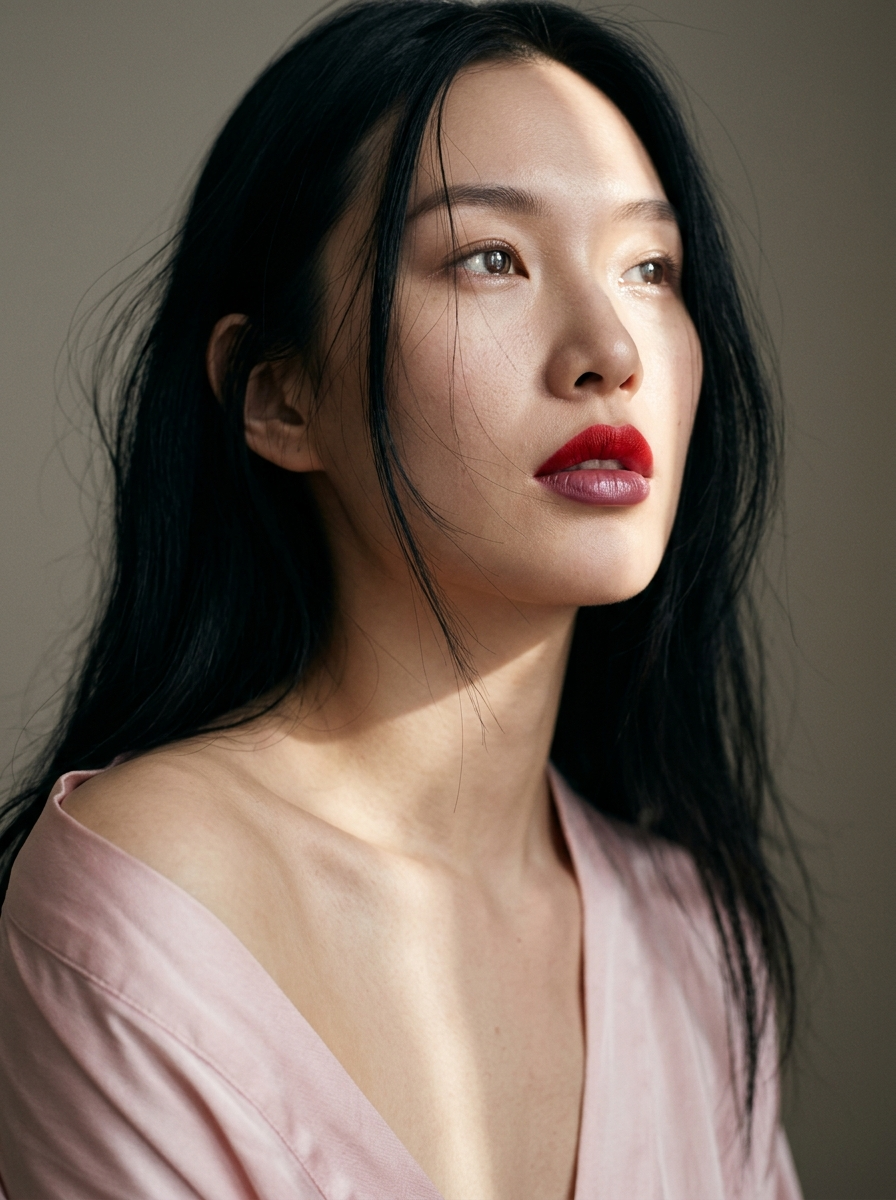 {"intent":"Generate an 8K ultra-photorealistic close-up fashion portrait with explicit editorial styling and sensual emphasis.","style":{"primary":"high-end photorealistic fashion photography","lighting":"sharp, diagonal beam of natural light illuminating cheekbone, nose bridge, and lips while the rest of the face falls into soft shadow","mood":" , sensual, refined editorial","technical":{"camera_type":"professional DSLR or mirrorless","lens_look":"50mm f\/1.2 prime lens aesthetic","aperture_look":"wide open for extremely shallow depth of field","iso":"low ISO","capture_format":"RAW","depth_of_field":"very shallow with creamy background blur","focus":"precise focus on eyes and lips","rendering":"high-frequency detail with clean studio quality and careful exposure"},"materials":{"skin":"pale, porcelain-like skin with pores, soft natural texture, and smooth tonal transitions","hair":"long, jet-hair slightly wind-swept, strands falling across the face","fabric":"lightweight silk with weave, delicate folds, and soft sheen"}},"frame":{"aspect_ratio":"9:16 vertical","composition":"tight close-up framing on face and shoulder","crop_emphasis":"gaze, lips, cheekbone highlights, and skin texture"},"subject":{"identity":{"face":{"preserve_original":true},"body":{"preserve_original":true}},"pose":{"head":"angled upward and turned slightly to the right","gaze":"eyes looking upward and to the right, catching the light","shoulders":"relaxed and partially "},"expression":"soft yet intense, sensual editorial presence","wardrobe":{"robe":"open light pink silk robe slipping off the shoulders","undergarments":"braless styling, implied and non-graphic","fabric_behavior":"silk drapes naturally, shoulder and collarbone"},"makeup":{"lips":"plump lips emphasized with a glossy mauve undertone and spotlighted by intense red matte lipstick ","skin_finish":"natural glow airbrushing","overall":"refined fashion makeup highlighting lips and eyes"}},"environment":{"location":"clean studio or softly lit interior","background":"neutral, subdued, fully out of focus"},"quality":{"resolution":"8K ultra-high-resolution","sharpness":"razor-sharp facial detail with smooth optical falloff","color_grading":"luxury fashion-grade color with preserved highlights and fabric detail","negative_prompt":["deformed","distorted","disfigured","poorly drawn","bad anatomy","extra limbs","fused fingers","blurry","low resolution","low quality","watermark","text","signature","illustration","painting","cartoon","3D render","CGI","airbrushed skin","plastic texture","overexposed","flat lighting","bright background","missing hair","unnatural eyes","double chin","asymmetrical face","flattened chest","small ","short shoulders"]},"priority_notes":["Preserve the exact face and body from the reference image","Maintain explicit editorial styling graphic content","Emphasize the interaction of light with skin, lips, and silk fabric","Keep the image refined, sensual, and fashion-focused"]}