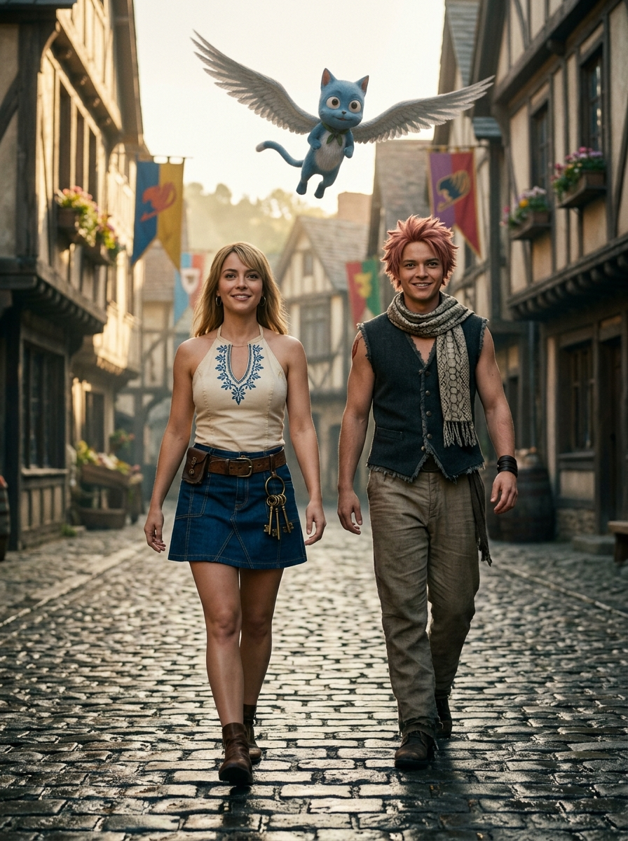 {"intent":{"summary":"Vertical cinematic live-action feature film still of Lucy Heartfilia, Natsu Dragneel, and Happy walking through Magnolia."},"frame":{"aspect_ratio":"9:16","shot_size":"Medium Full Shot (knees up)","orientation":"Portrait","composition_guide":"Dynamic depth; Lucy leading, Natsu slightly offset, Happy flying in the upper third to balance the vertical frame."},"subject":{"subject_type":"Live-action humans + cinematic creature","identity_summary":"Adult actors portraying Lucy Heartfilia and Natsu Dragneel; Happy depicted as a realistic blue-furred feline creature with wings.","visual_signature":{"facial_signature":{"notes":"Feature-film makeup: realistic skin pores, micro-expressions, natural eye moisture, and weathered skin from travel.","unique_features":"Lucy: hair with natural highlights and realistic movement. Natsu: naturally coarse salmon-pink hair (not a wig), styled with grit and texture."},"body_signature":{"proportions":"Athletic, realistic adult builds; Natsu with subtle lean muscle definition; Lucy with practical adventurer physique.","skin_tone_and_texture":"Slightly tanned, natural skin textures, subtle dust\/dirt from the road for realism."}},"pose_and_action":{"description":"The trio is mid-stride toward the camera; Lucy looks confident and leading; Natsu has a relaxed, ready-for-action posture; Happy is flying naturally above them with realistic wing-fanning motion.","facial_expression":"Determined, friendly smiles","gaze_direction":"Toward camera\/viewer"},"inventory":{"wardrobe":{"Lucy":"Cream-colored canvas halter top with blue embroidery, aged leather utility belt with heavy brass celestial keys, indigo dyed denim skirt with heavy-duty stitching.","Natsu":"Heavy charcoal-wool waistcoat with frayed edges, rugged linen trousers, and a scarf with realistic reptilian scale-patterned silk weave."},"Happy":"Realistic blue fur texture, small feathered wings with believable anatomy."}},"environment":{"setting_type":"Medieval-fantasy town","location_description":"Magnolia street with cobblestones, timber-framed Tudor architecture, colorful guild banners fluttering, and flower boxes in windows.","time_of_day":"Golden hour (late afternoon sun)","weather_conditions":"Clear, hazy atmosphere"},"lighting":{"global_illumination":"Cinematic outdoor lighting","primary_source":"Low-angle sun providing warm rim lighting (2800K-3000K)","fill":"Soft bounce light from the cobblestones to illuminate facial details","shadow_quality":"Long, soft, atmospheric shadows","color_temperature":"Warm, golden amber"},"camera":{"angle":"Slightly low angle (chest height) to emphasize heroism distorting limbs","lens_type":"50mm Prime","focal_length_mm":50,"aperture":"f\/2.2","notes":"Beautiful creamy bokeh, shallow depth of field separating the trio from the town background"},"post_processing":{"art_medium":"35mm film photography","style_modifiers":"Anamorphic flares, subtle film grain, high dynamic range","color_grade":"Rich saturated warm tones, deep teal shadows, classic cinematic contrast","quality_boosters":"8k resolution, photorealistic fur and fabric simulation, ray-traced reflections"},"negative":{"artifact_suppression":"anime, cartoon, illustration, drawing, wig, plastic hair, cosplay, convention, bright blue plastic, fake keys, low quality, 3d render, doll, toy, floating, detached wings, extra limbs, messy anatomy, watermark","subject_excludes":" , neon hair, costume shop quality"}}