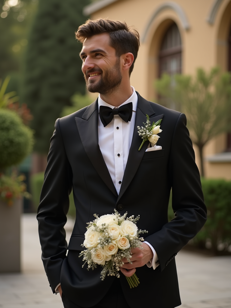 Joyful wedding celebration. Model holding a bouquet, posing elegantly for timeless wedding photography. Model wearing a luxurious black suit . Soft natural light.