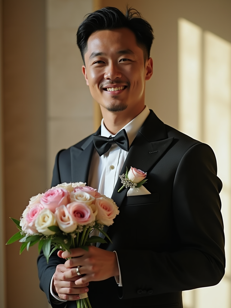 Joyful wedding celebration. Model holding a bouquet, posing elegantly for timeless wedding photography. Model wearing a luxurious black suit . Soft natural light.