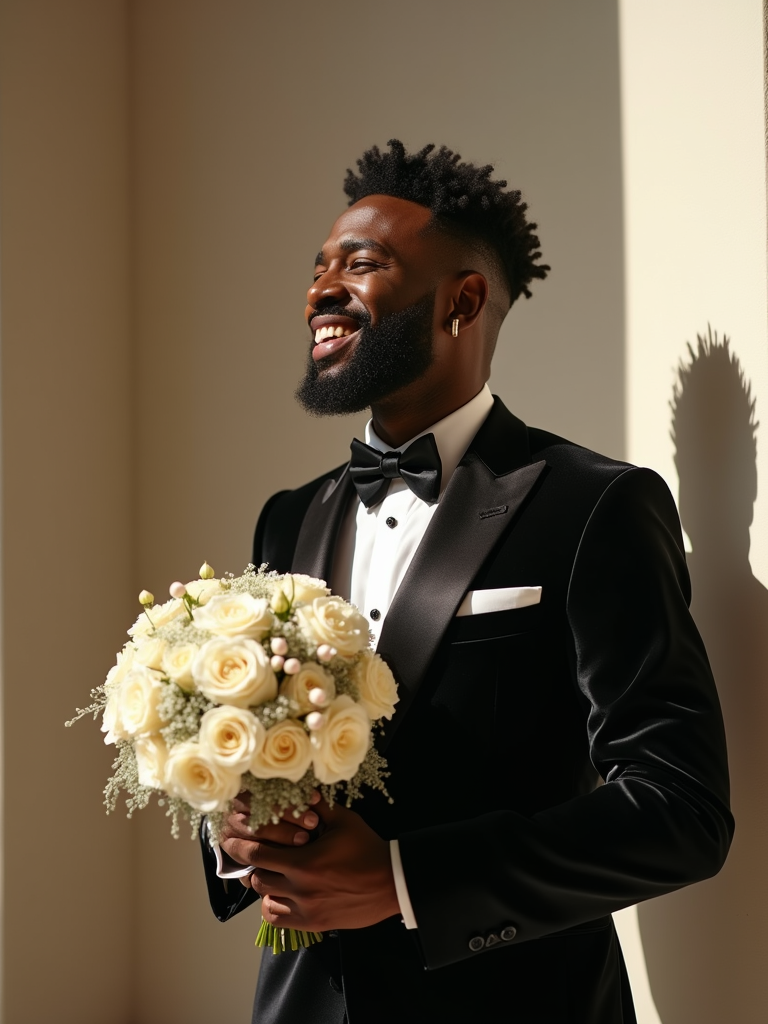 Joyful wedding celebration. Model holding a bouquet, posing elegantly for timeless wedding photography. Model wearing a luxurious black suit . Soft natural light.
