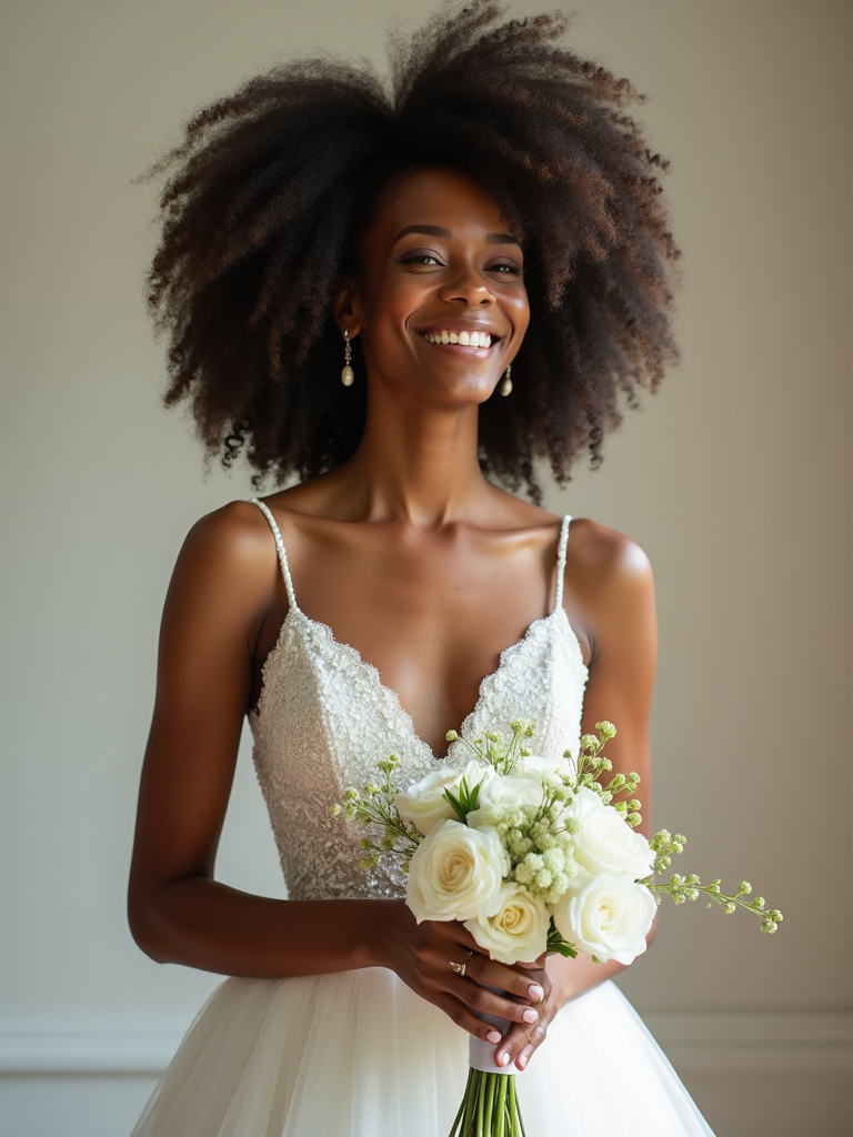 Joyful wedding celebration. Model holding a bouquet, posing elegantly for timeless wedding photography. Model wearing a stylish wedding dress . Soft natural light.