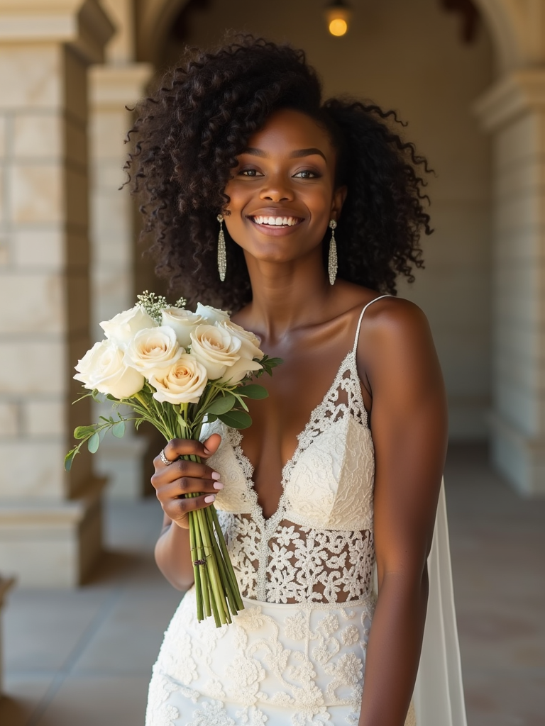 Joyful wedding celebration. Model holding a bouquet, posing elegantly for timeless wedding photography. Model wearing a stylish wedding dress . Soft natural light.