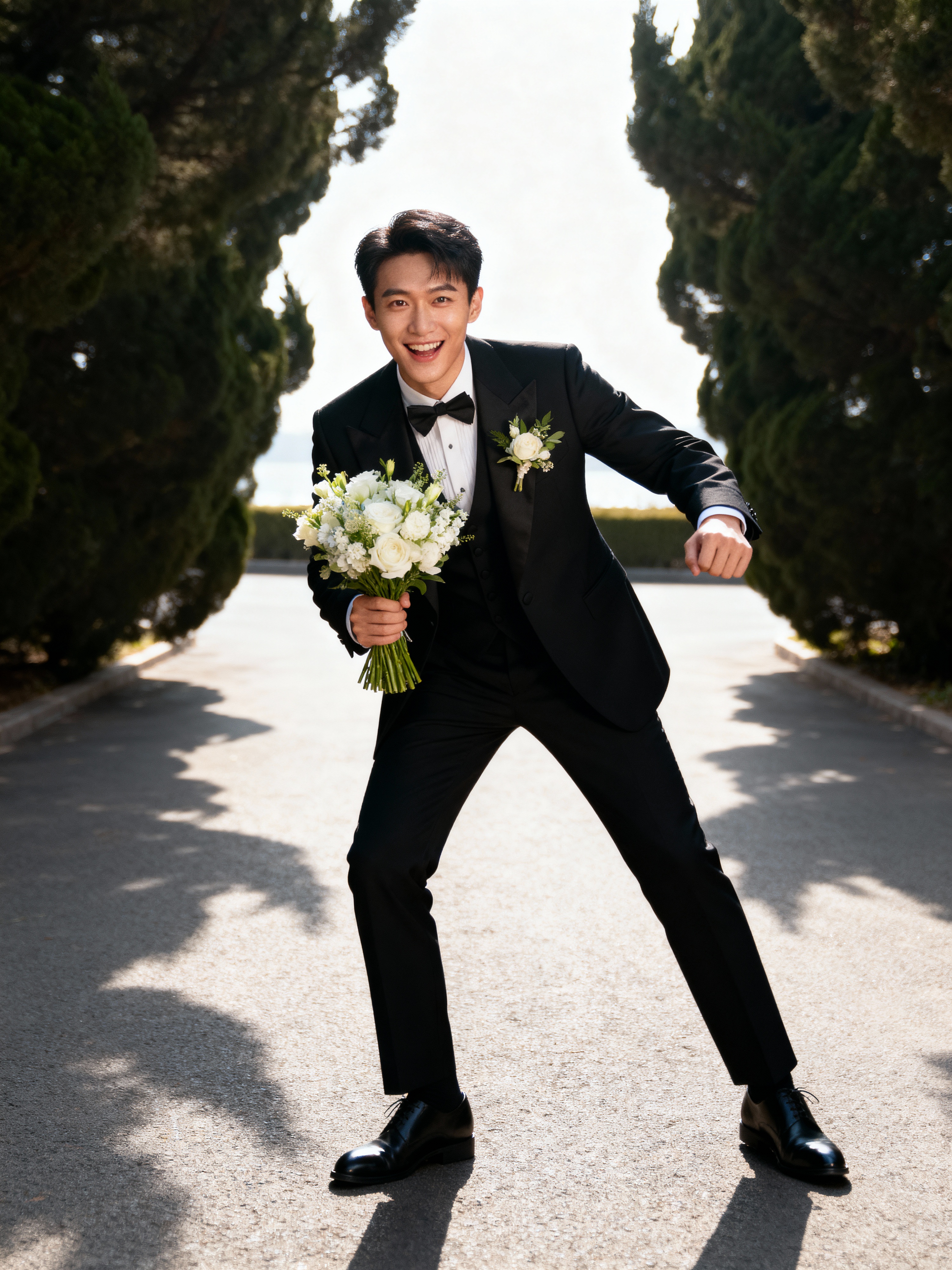 Joyful wedding celebration. Model holding a bouquet, posing elegantly for timeless wedding photography. Model wearing a luxurious black suit with boutonnière . Soft natural light.