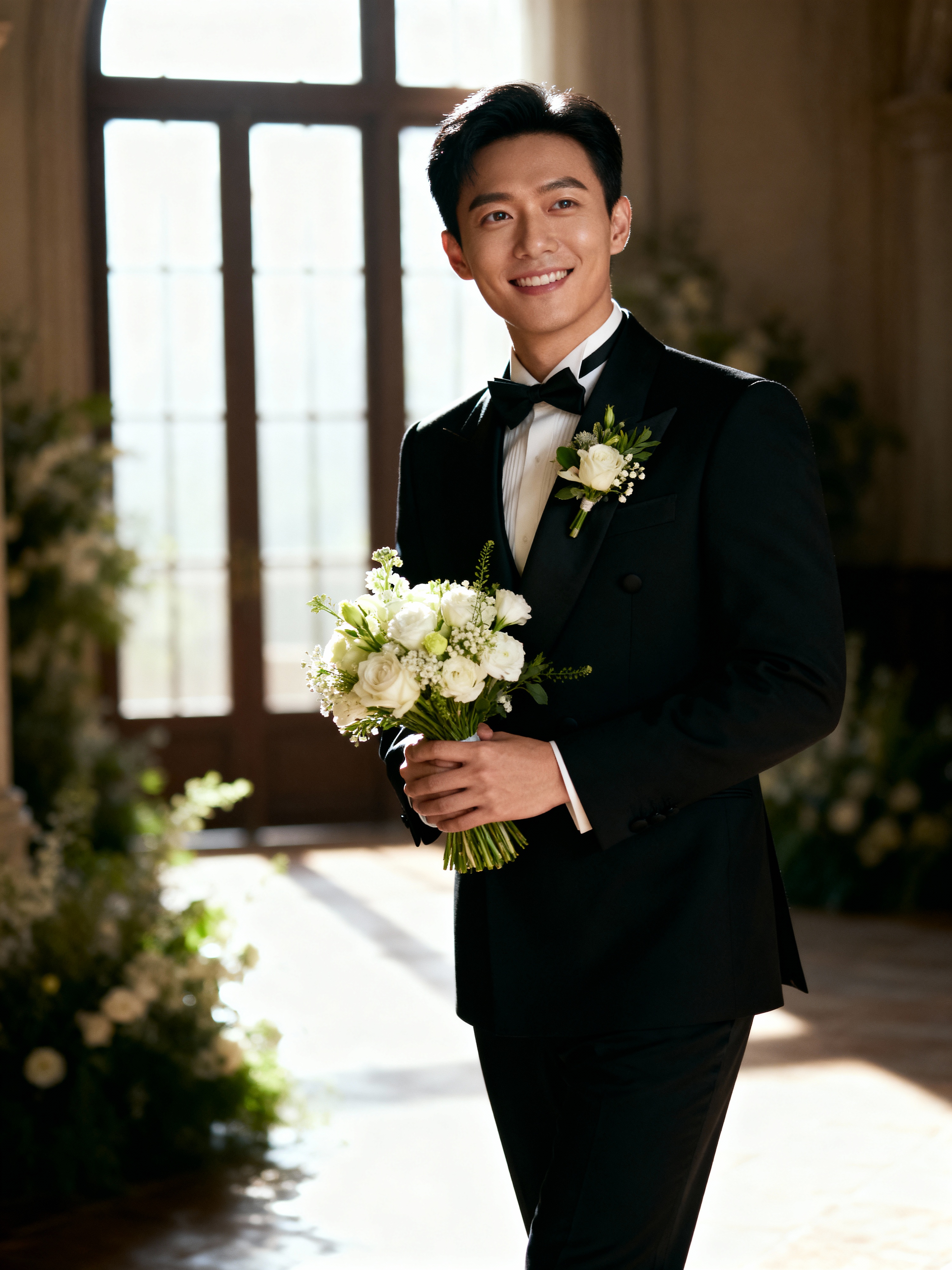 Joyful wedding celebration. Model holding a bouquet, posing elegantly for timeless wedding photography. Model wearing a luxurious black suit with boutonnière . Soft natural light.