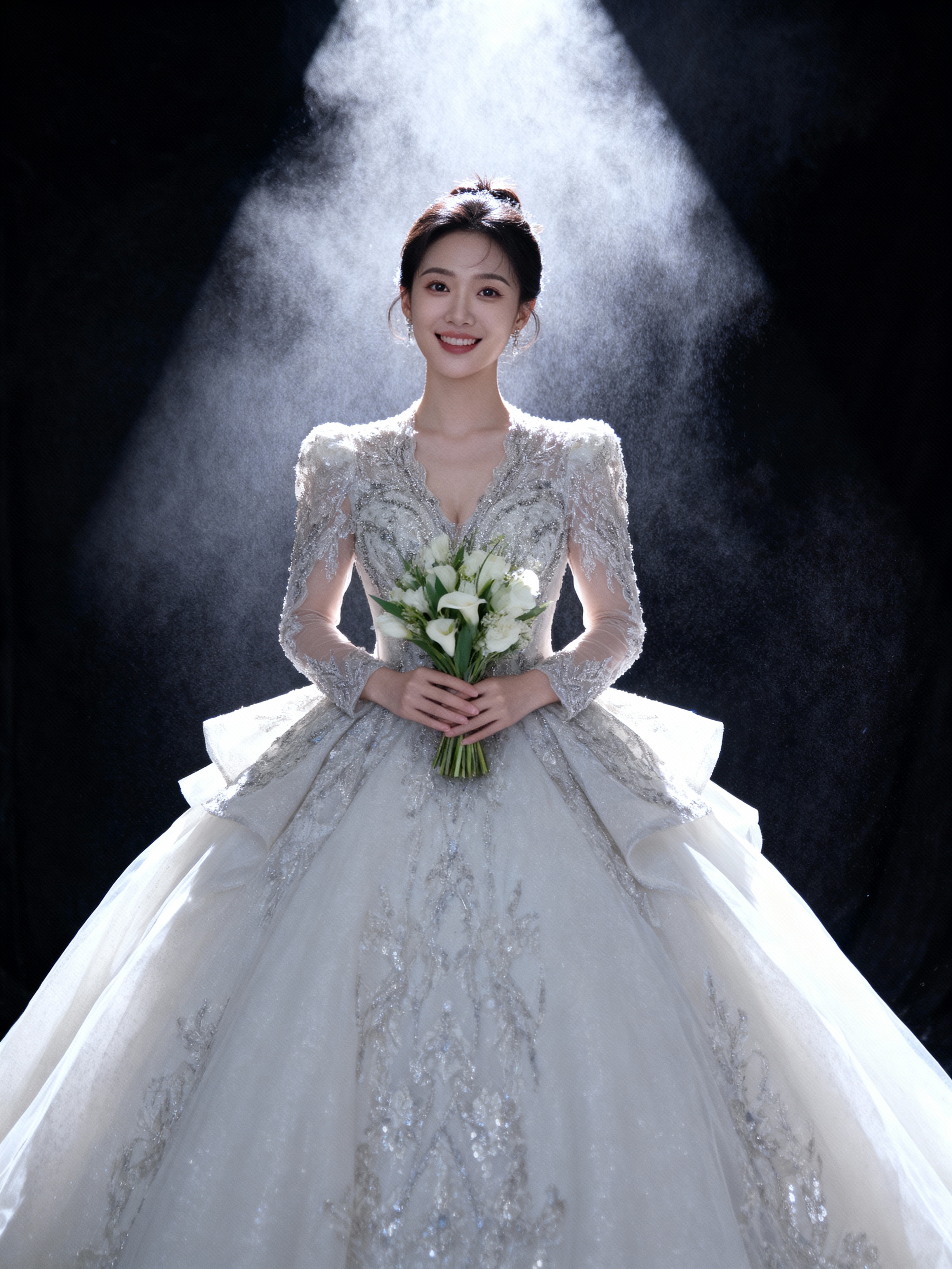 Joyful wedding celebration. Model holding a bouquet, posing elegantly for timeless wedding photography. Model wearing a stylish wedding dress . Soft natural light.