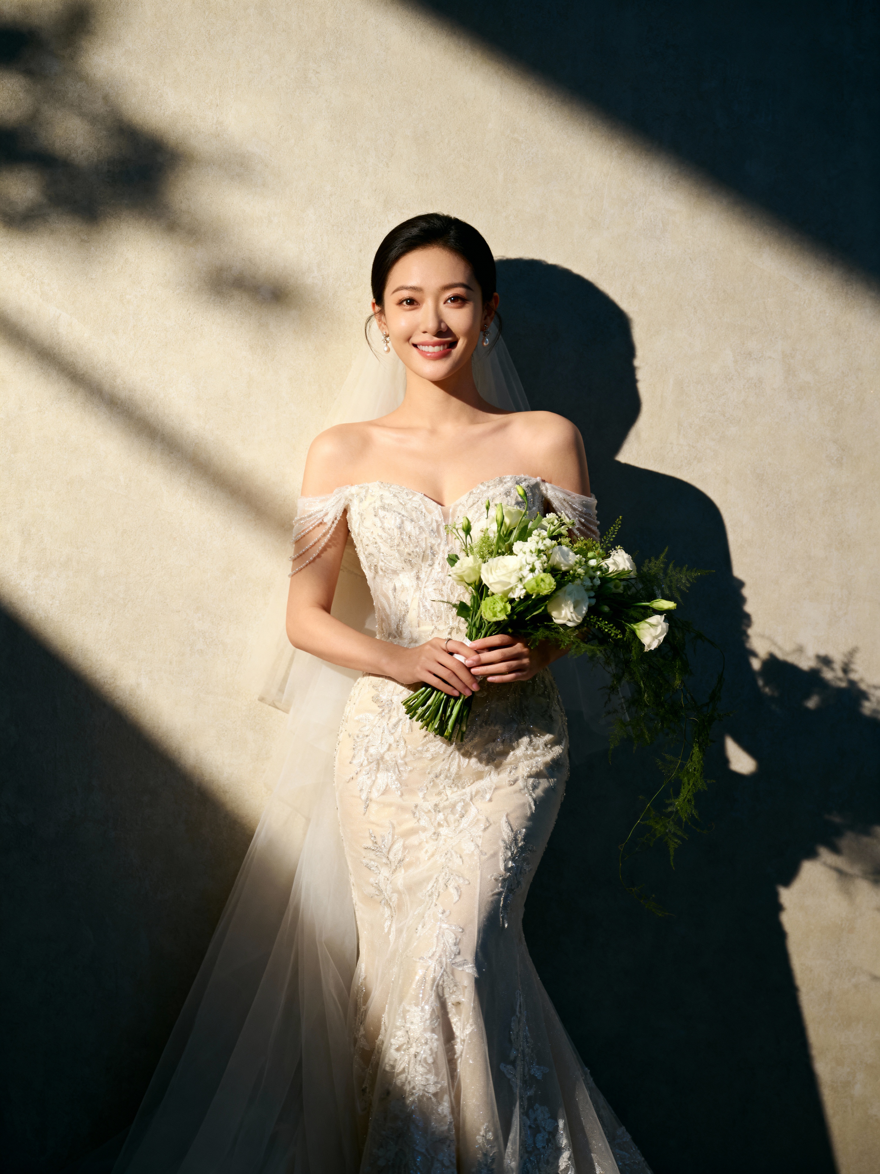 Joyful wedding celebration. Model holding a bouquet, posing elegantly for timeless wedding photography. Model wearing a stylish wedding dress . Soft natural light.