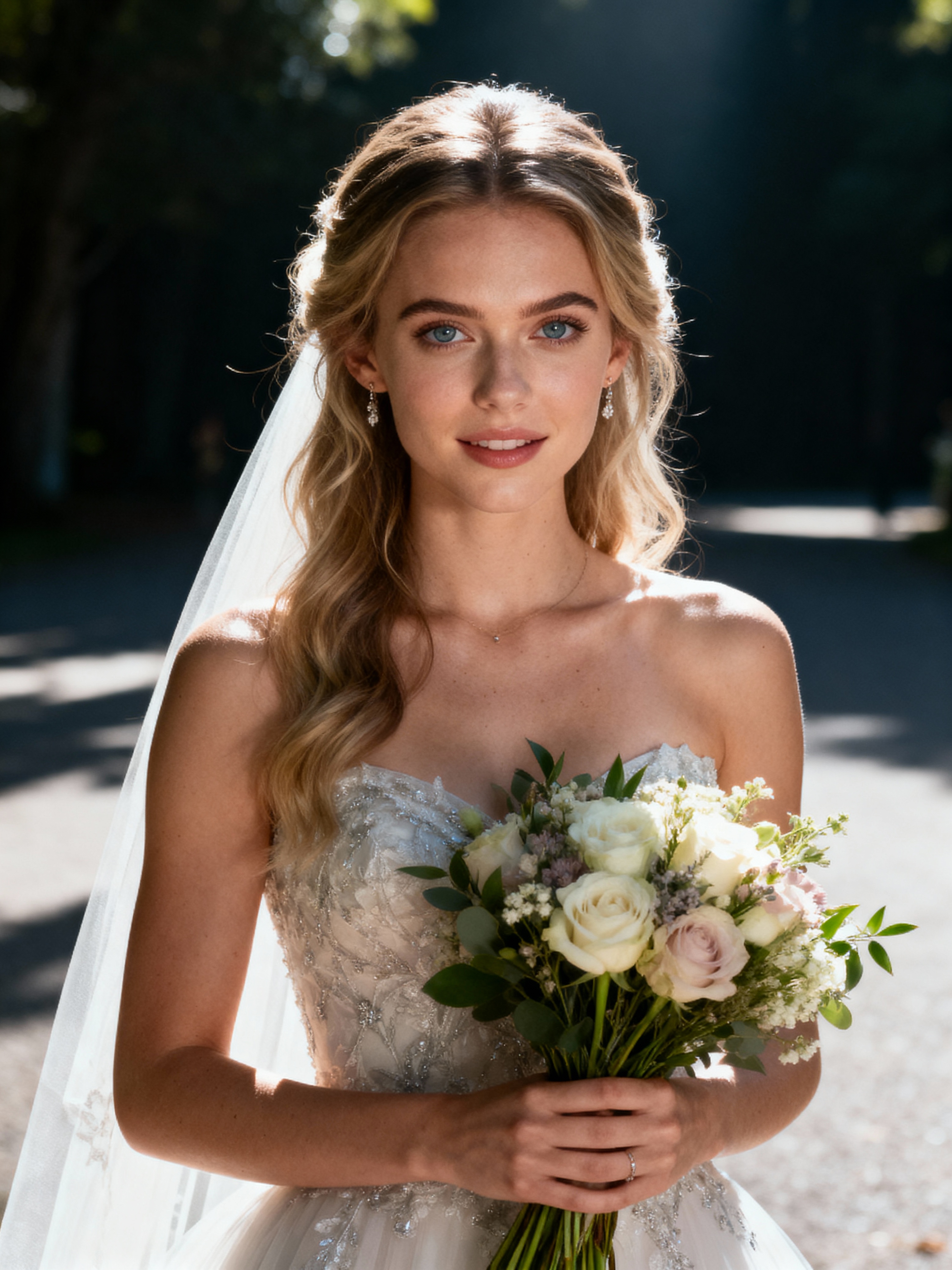 Joyful wedding celebration. Model holding a bouquet, posing elegantly for timeless wedding photography. Model wearing a stylish wedding dress . Soft natural light.