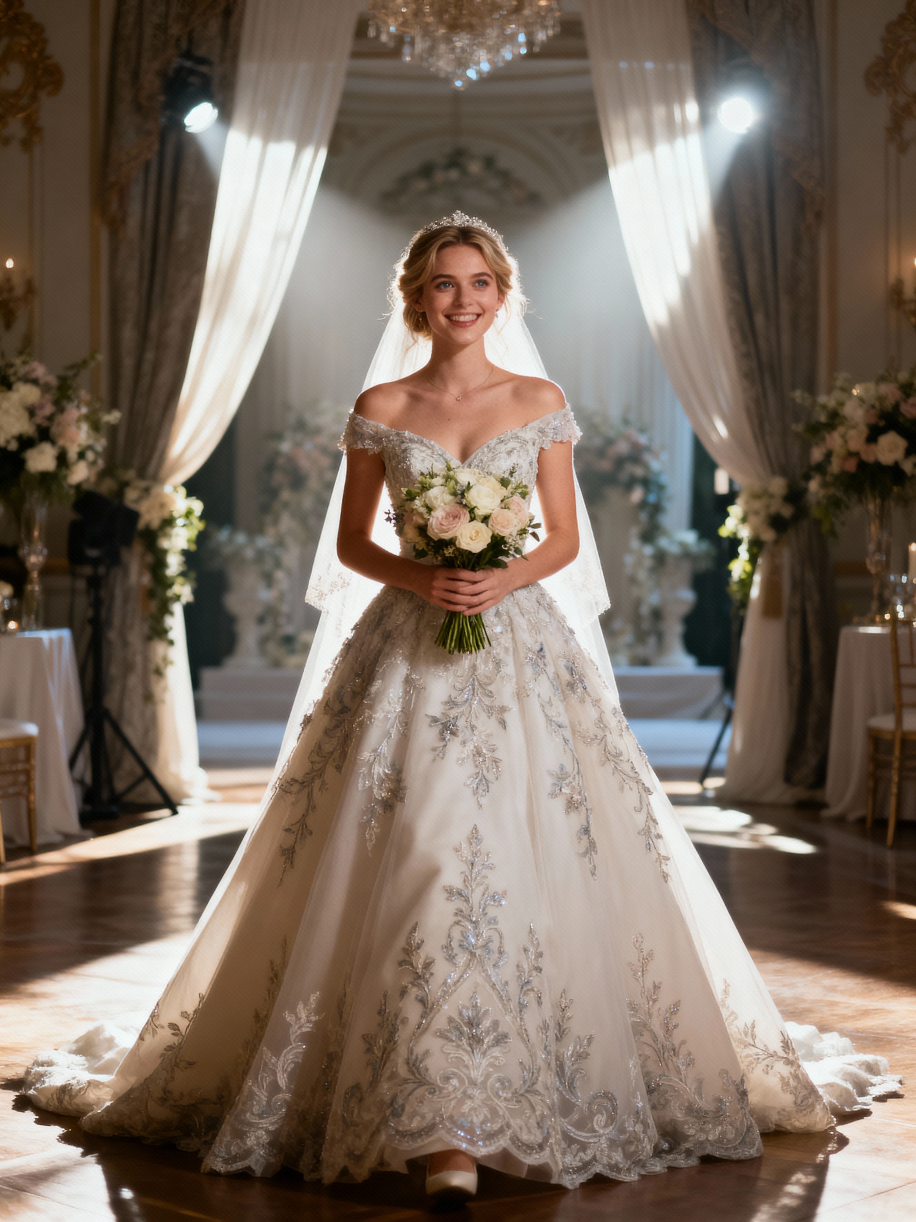 Joyful wedding celebration. Model holding a bouquet, posing elegantly for timeless wedding photography. Model wearing a stylish wedding dress . Soft natural light.