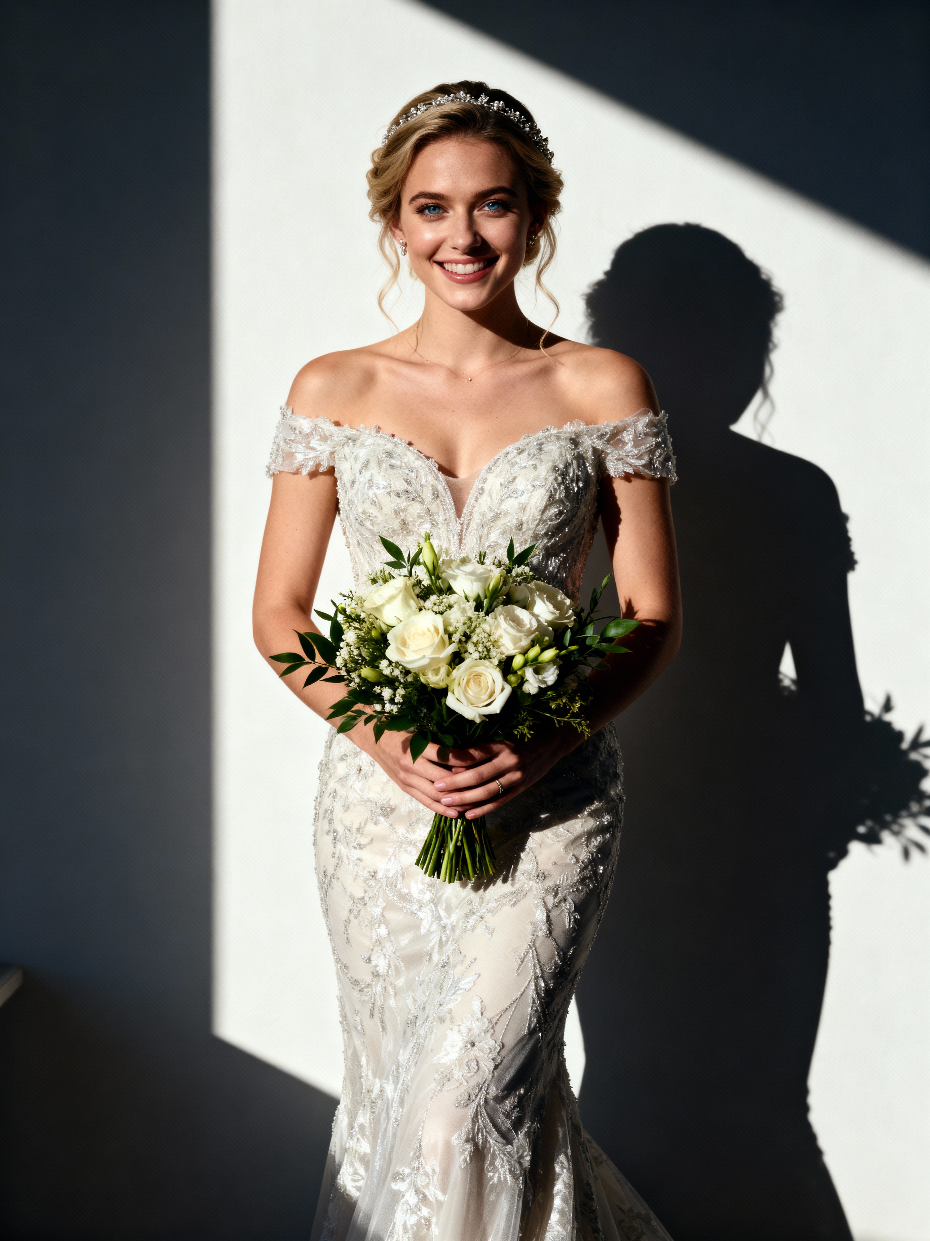 Joyful wedding celebration. Model holding a bouquet, posing elegantly for timeless wedding photography. Model wearing a stylish wedding dress . Soft natural light.