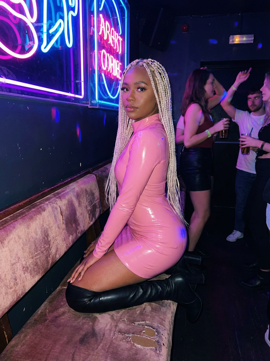 kneeling model as model, pink latex, thigh high boots night club, neon lights, platinum blonde