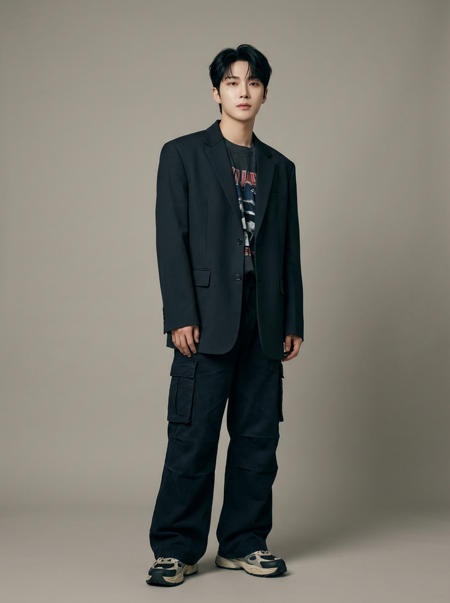 Korean model (with black hair) (as korean kpop k-pop idol) posing for photo, wearing Korean clothes, Korean fashion, Korean fashion, Korean makeup, (in front of solid background)