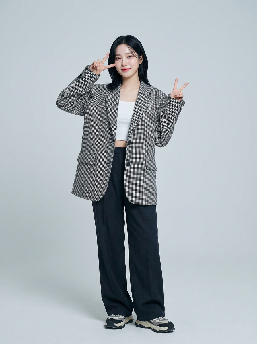 Korean model (with black hair) (as korean kpop k-pop idol) posing for photo, wearing Korean clothes, Korean fashion, Korean fashion, Korean makeup, (in front of solid background)